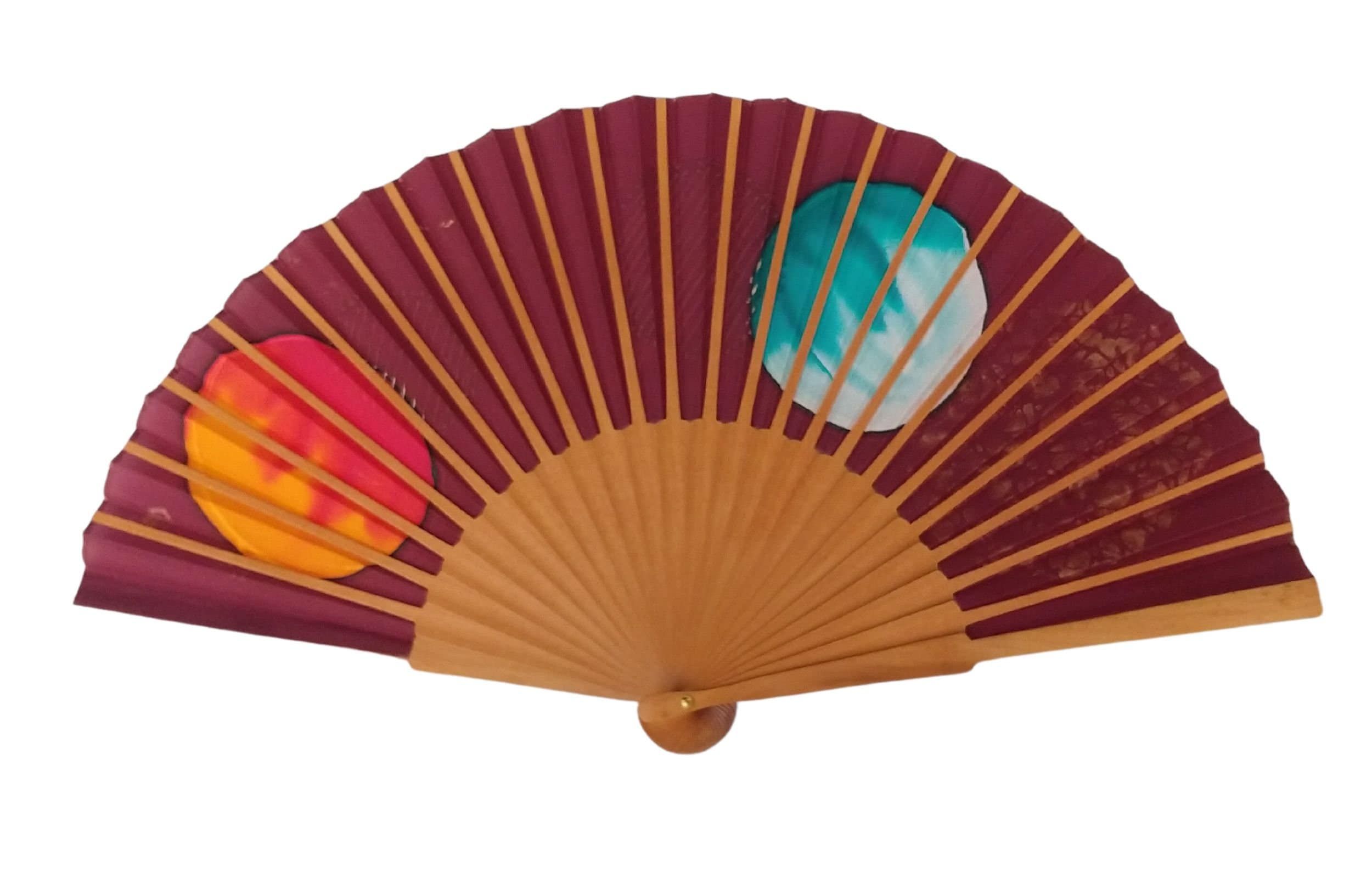 Descubra la fusión perfecta de elegancia y expresión artística con este abanico de seda pintado a mano. El fondo burdeos intenso contrasta maravillosamente con el turquesa intenso, el rojo anaranjado cálido y los detalles dorados, creando una composición abstracta y sofisticada que se siente moderna y atemporal.