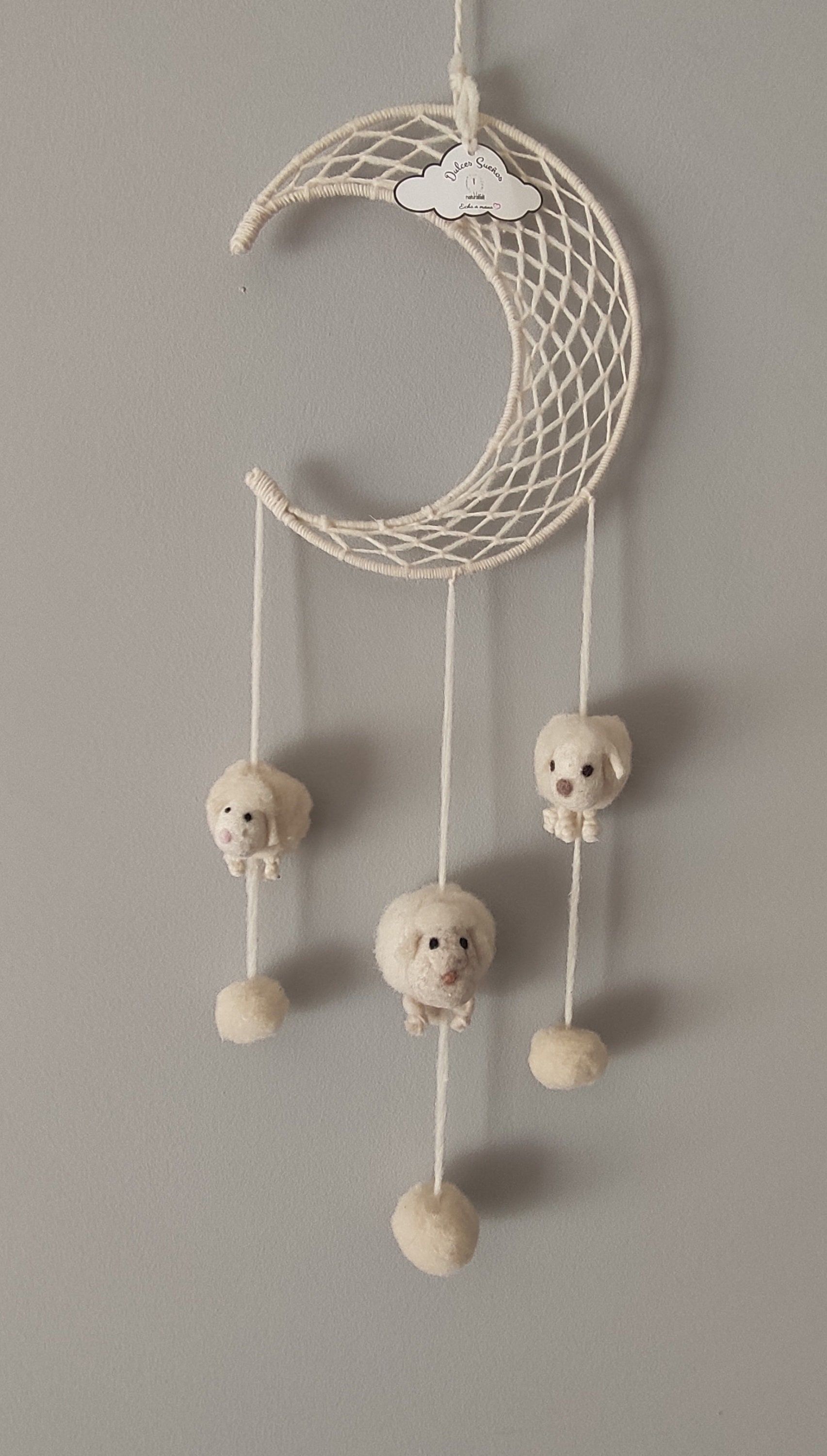Atrapasueño Luna con ovejitas. , hecho a mano, con lana Merino de España