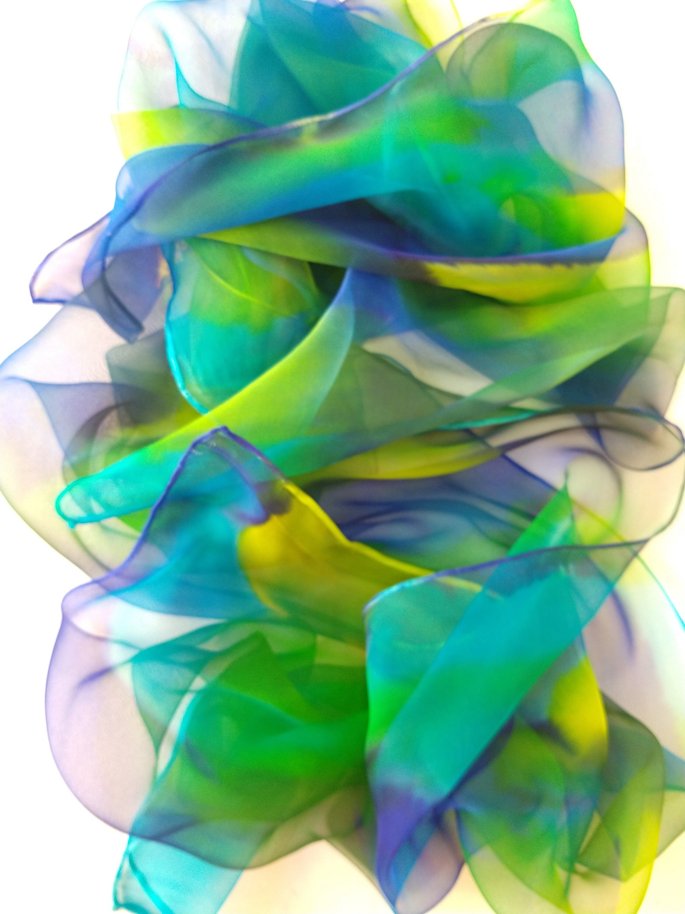Pinto personalmente a mano cada pañuelo de seda, uno a la vez, en mi estudio ubicado en la hermosa ciudad de Barcelona, en Europa, y nunca uso plantillas. Las sedas que creo son únicas en este planeta.