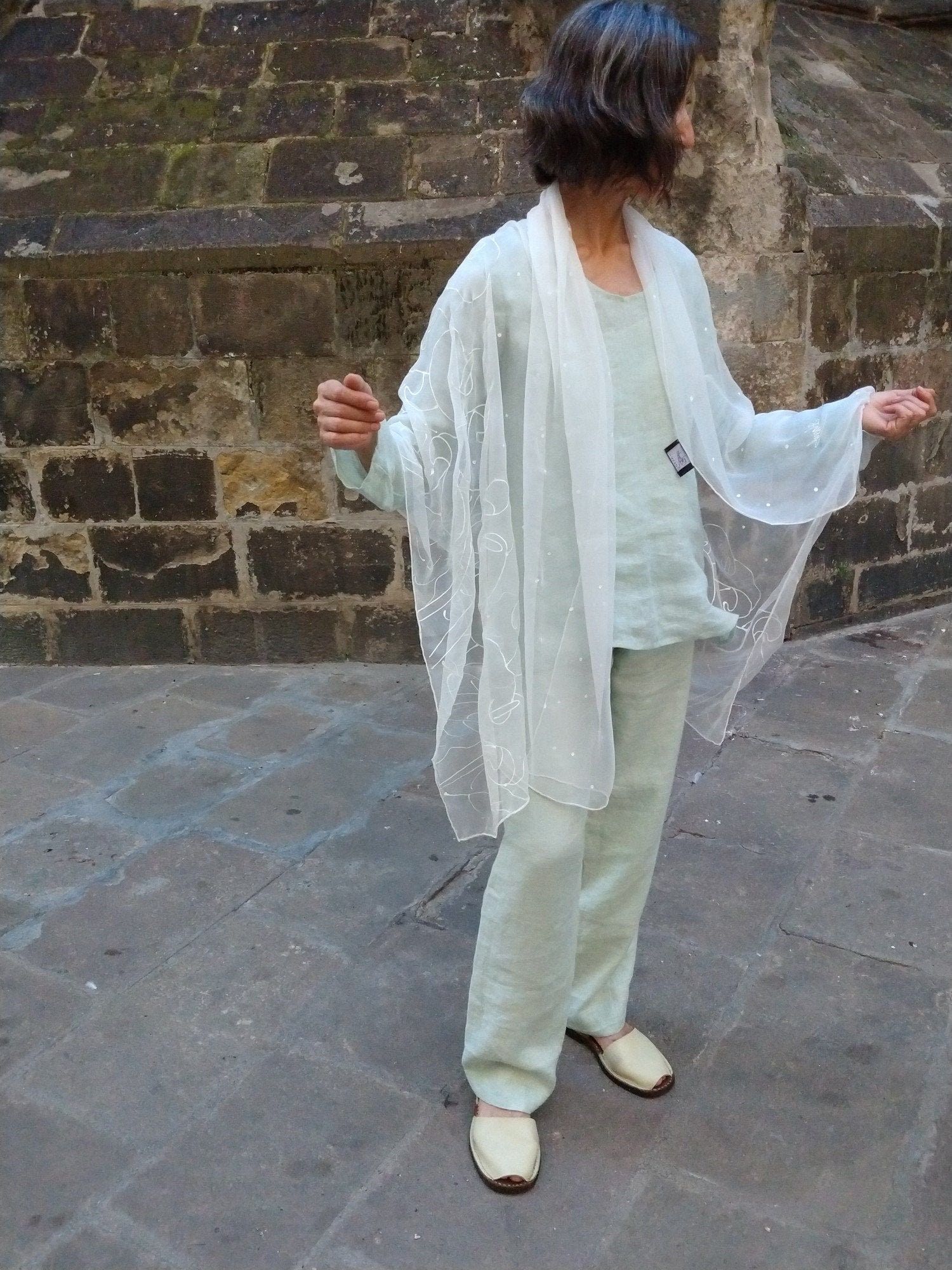 Pinto personalmente a mano cada pañuelo de seda, uno a la vez, en mi estudio ubicado en la hermosa ciudad de Barcelona, en Europa, y nunca uso plantillas. Las sedas que creo son únicas en este planeta.