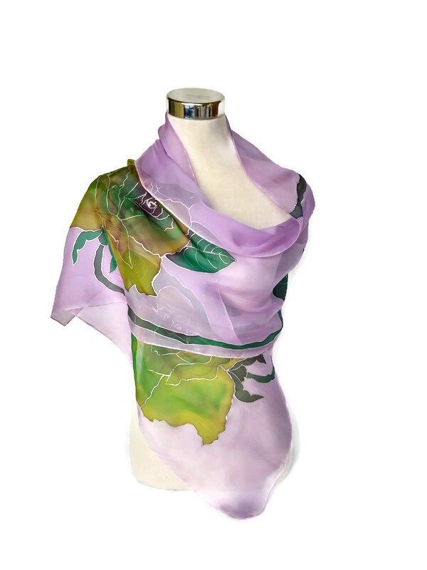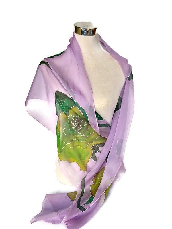 Chal de seda para boda con diseño de rosas verdes / Hermoso pañuelo largo de gasa con estampado floral violeta