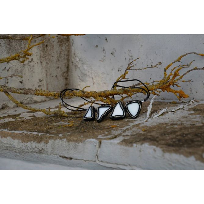 Collar blanco de ceramica reciclada formado por 4 piezas triamgulares traversalmente y cada una de ellas montadas en cuero y rodeadas de cremallera