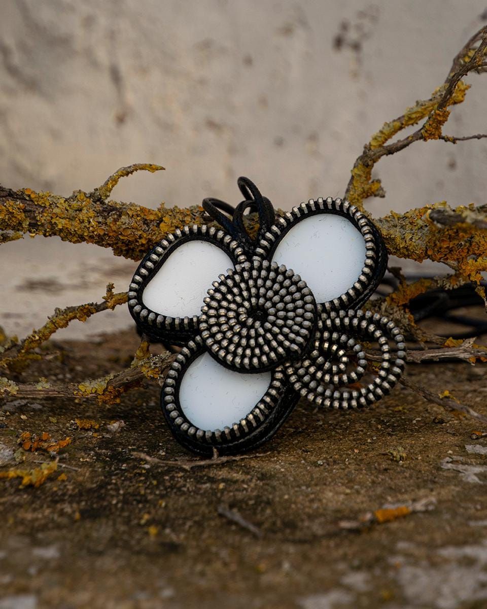 collar elaboraqdo con ceramica reciclada con forma de flor y una de las hojas realizada con cremallera