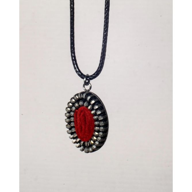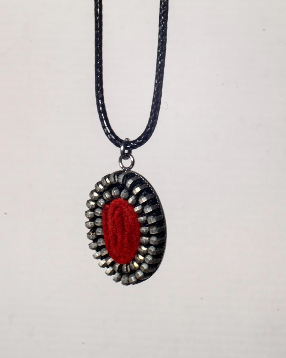 collar de forma oval pequeño hecho con dos vueltas de cremallera y una pieza central de serraje reciclado en color rojo.