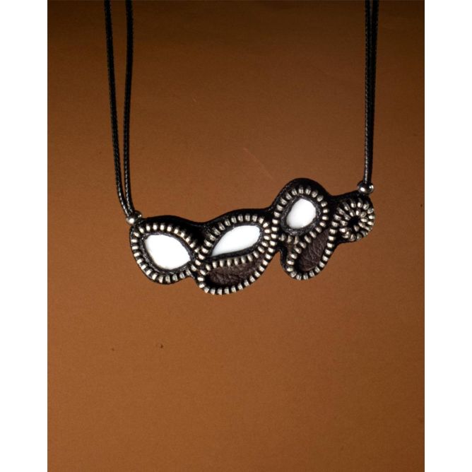 Collar blanco de ceramica reciclada, con cremallera montado en piel.