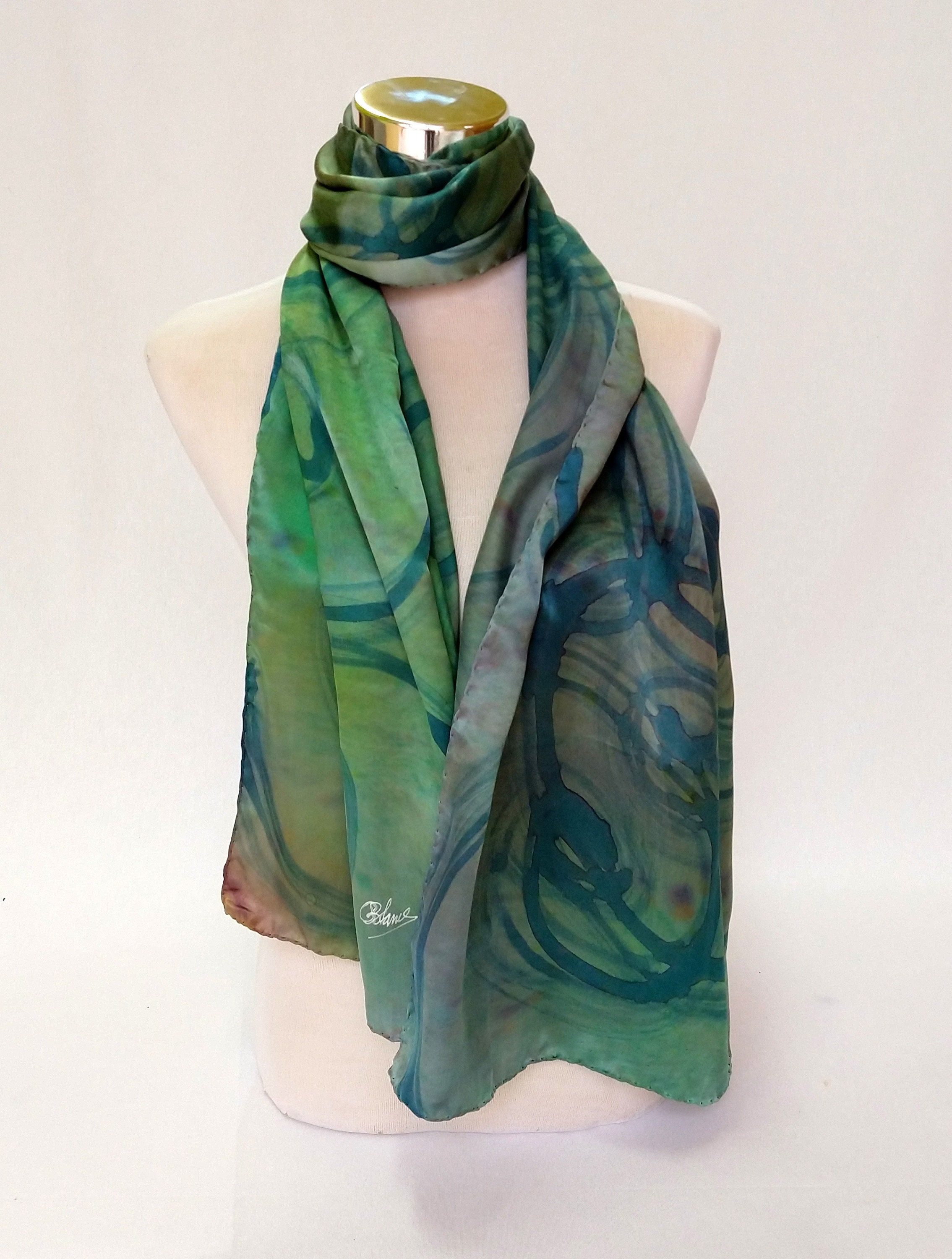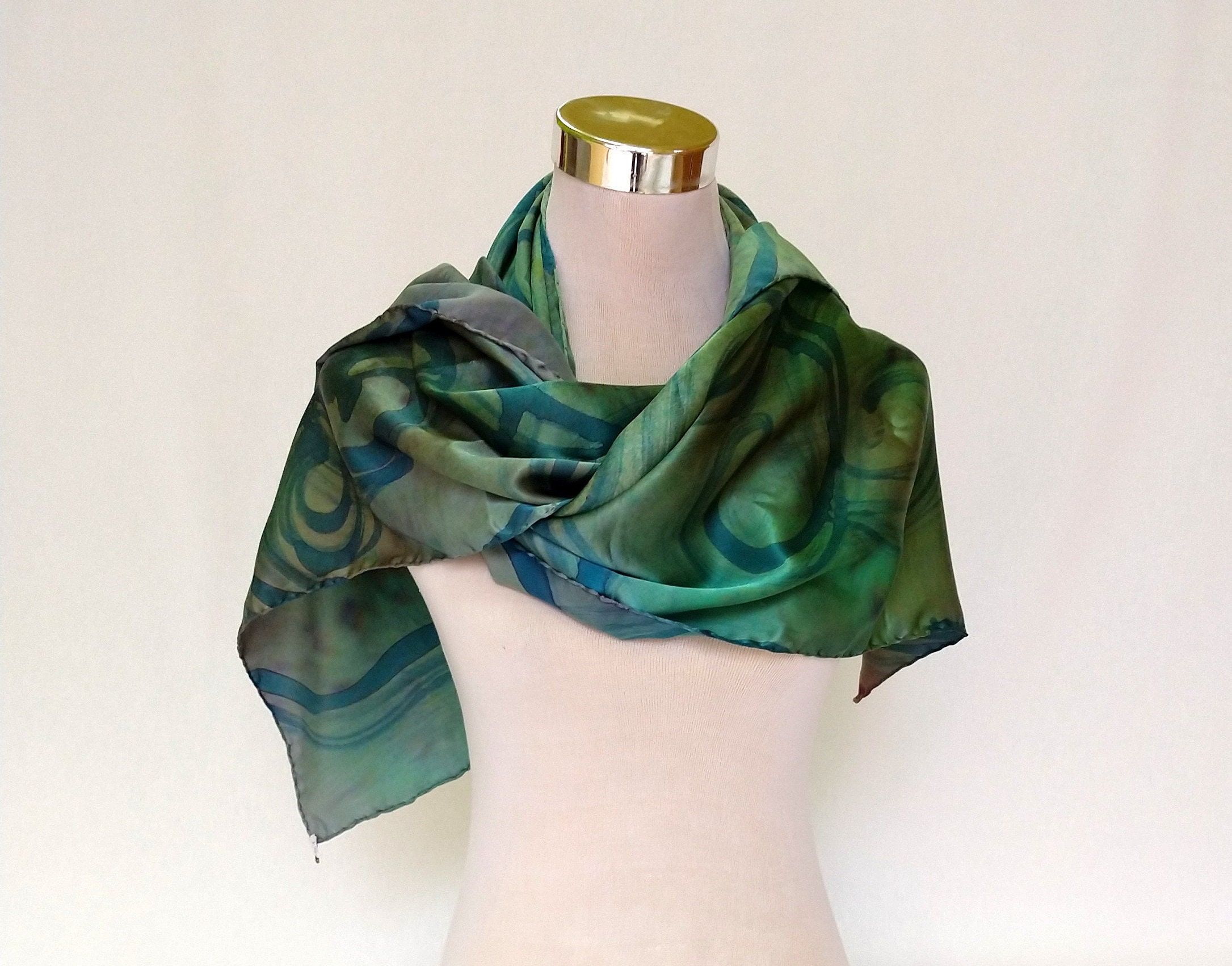 Elegante bufanda de seda verde oscuro para mujer: pañuelo grande de satén pintado a mano