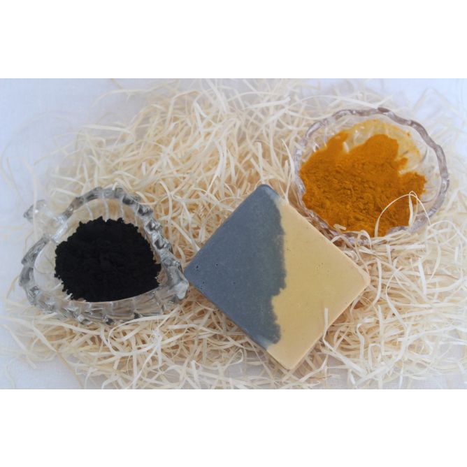 El Jabón de Glicerina con Carbón Activado y Cúrcuma remueve toxinas y ayuda con el acné, la psoriasis y el eczema.