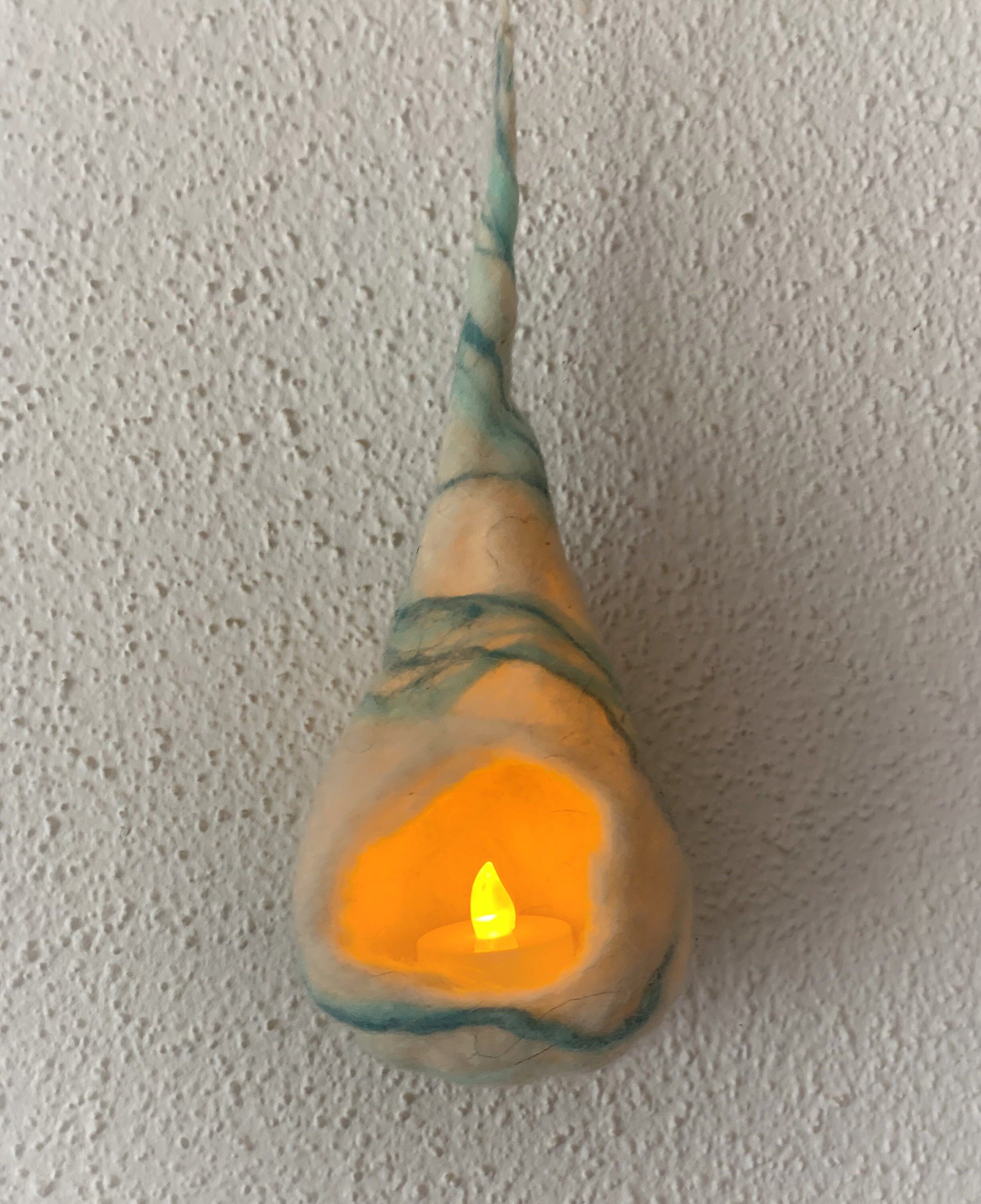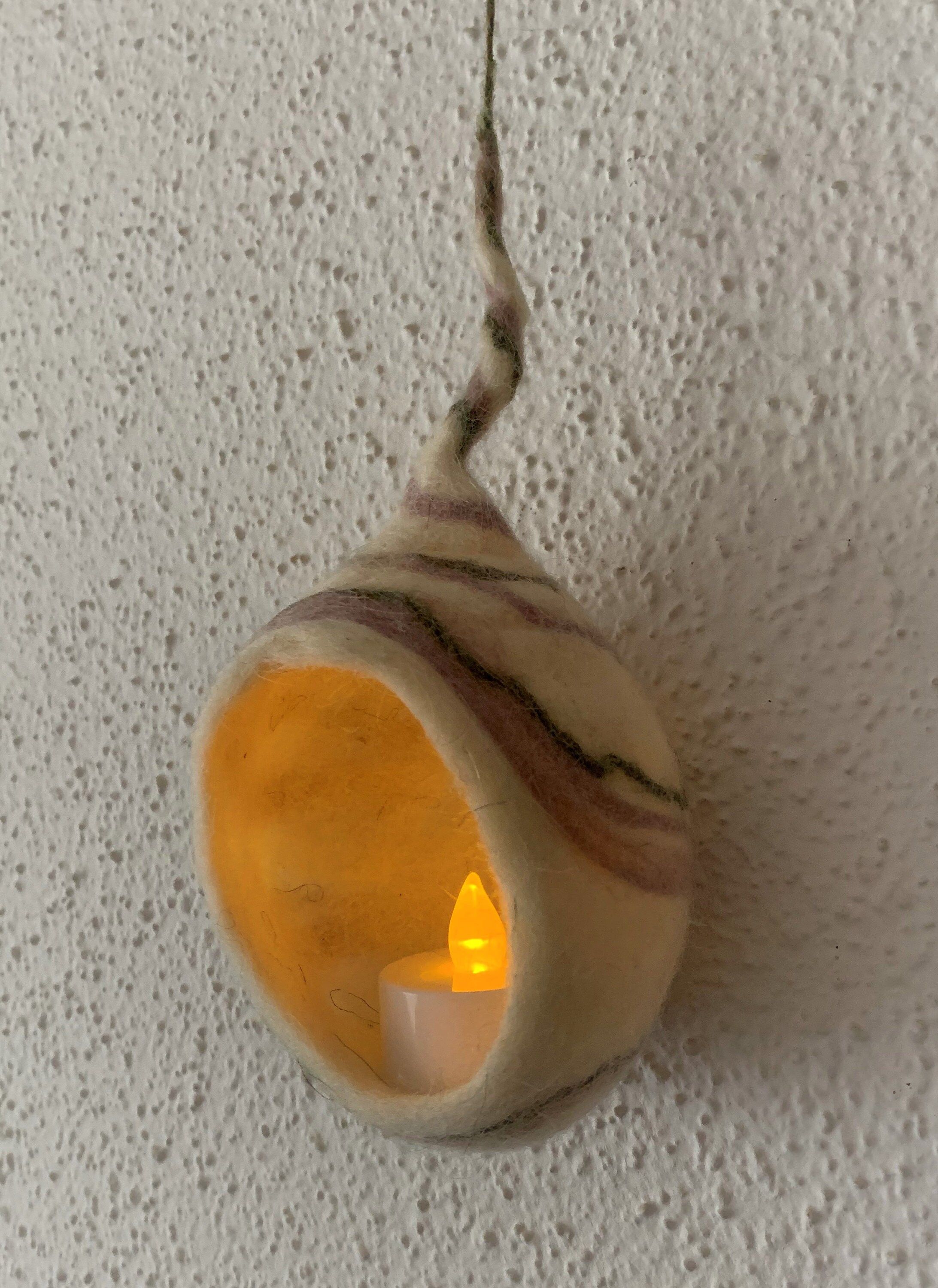 Nido de luz hecho en fieltro con lana de las Islas Baleares. Medidas aproximadas 17cm x 8cm x 8cm. Cada pieza es única y está hecha a mano usando los tradicionales métodos de afieltrado de lana. (incluye vela led)