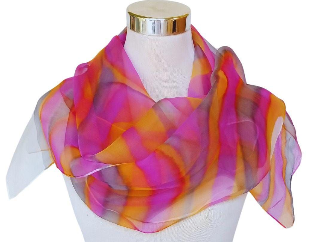 Bufanda de gasa de seda natural pintada a mano en vibrantes tonos rosa, naranja y gris