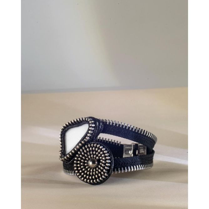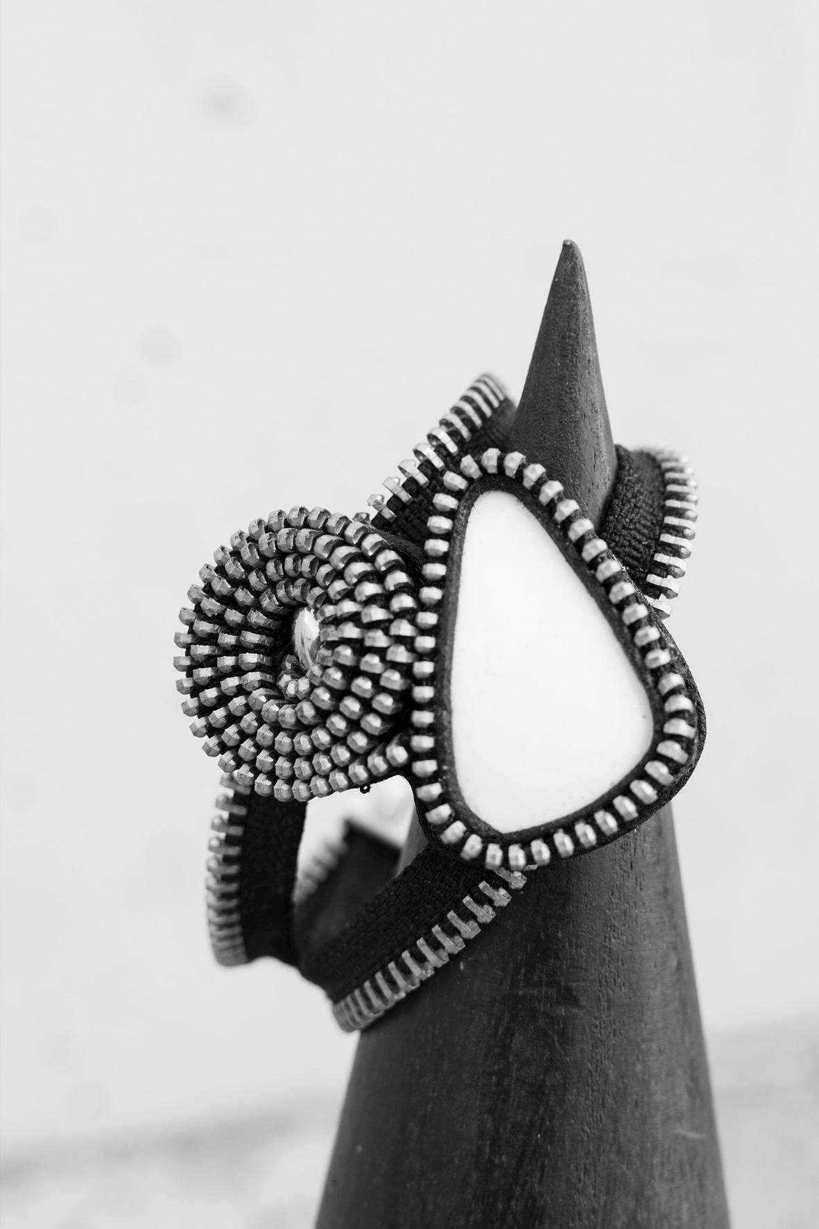 Pulsera hecha con cremallera y ceramica reciclada blanca , esta compuestramde un triangulo de ceramica rodeado de cremallera y na espiral de cremallera que forman la pieza unica.