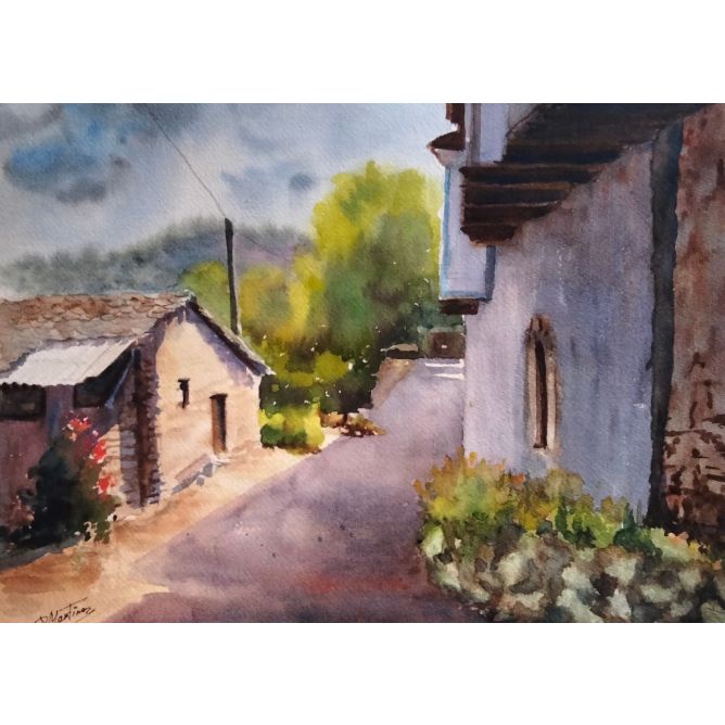 Acuarela pintada del natural, cae la tarde en un pueblo solitario castellano, no se ve ningún habitante, quizás estén dentro al calor de la lumbre. Estos pueblos tan bonitos se van quedando solos aunque las flores siguen adornando sus fachadas.