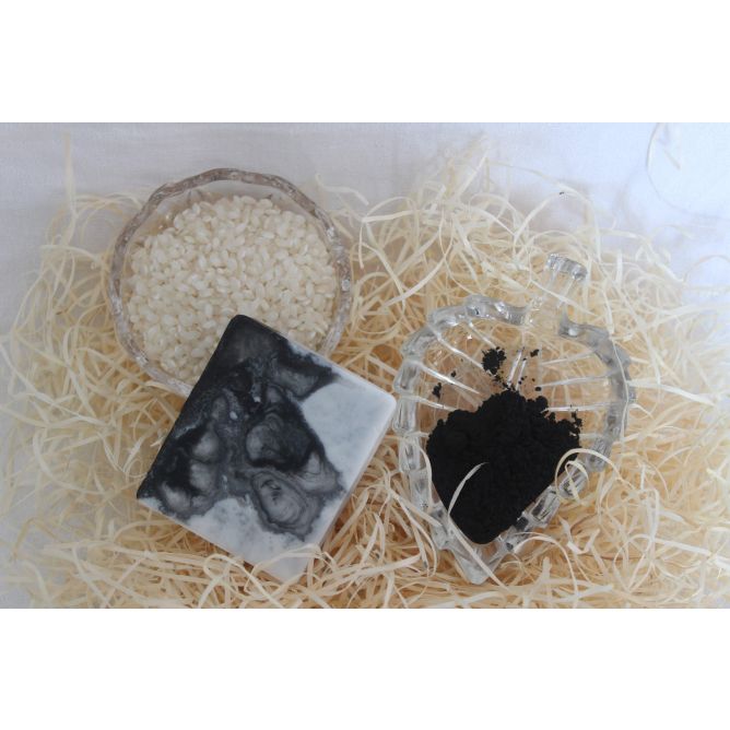 El Jabón de Glicerina con Carbón Activado y Arroz es ideal para la limpieza de los poros. Exfolia y blanquea la piel.