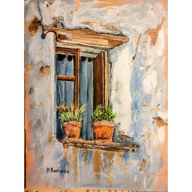 Pintura de una ventana de una casa de pueblo de Tarragona.