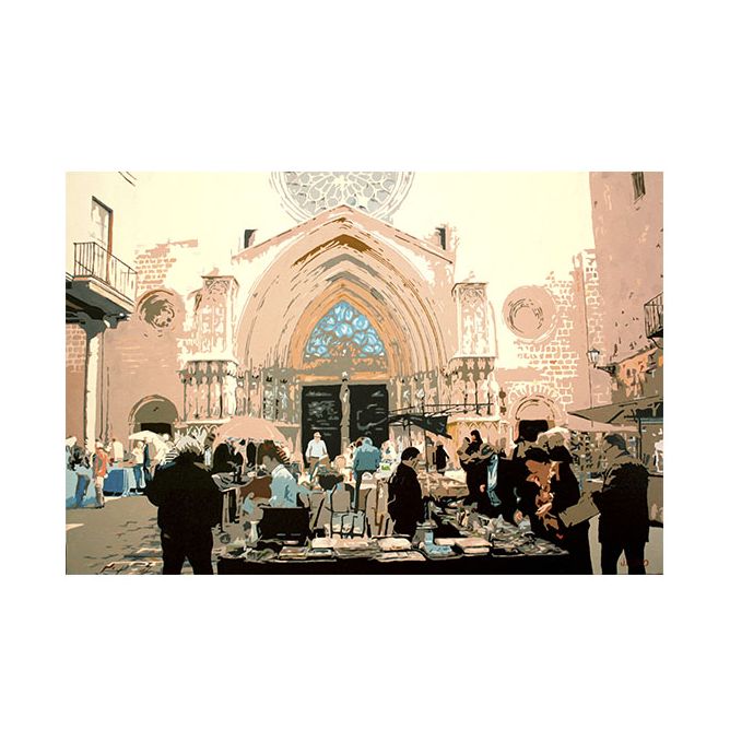 Una escena llena de vida y color de un mercadillo frente a la majestuosa catedral de Tarragona, pintada al óleo sobre tela por el talentoso Javier Calvo. Montada en un bastidor de 100x81 cm y acompañada de certificado de autenticidad, esta obra captura el bullicio y la belleza histórica de la ciudad en perfecta armonía.