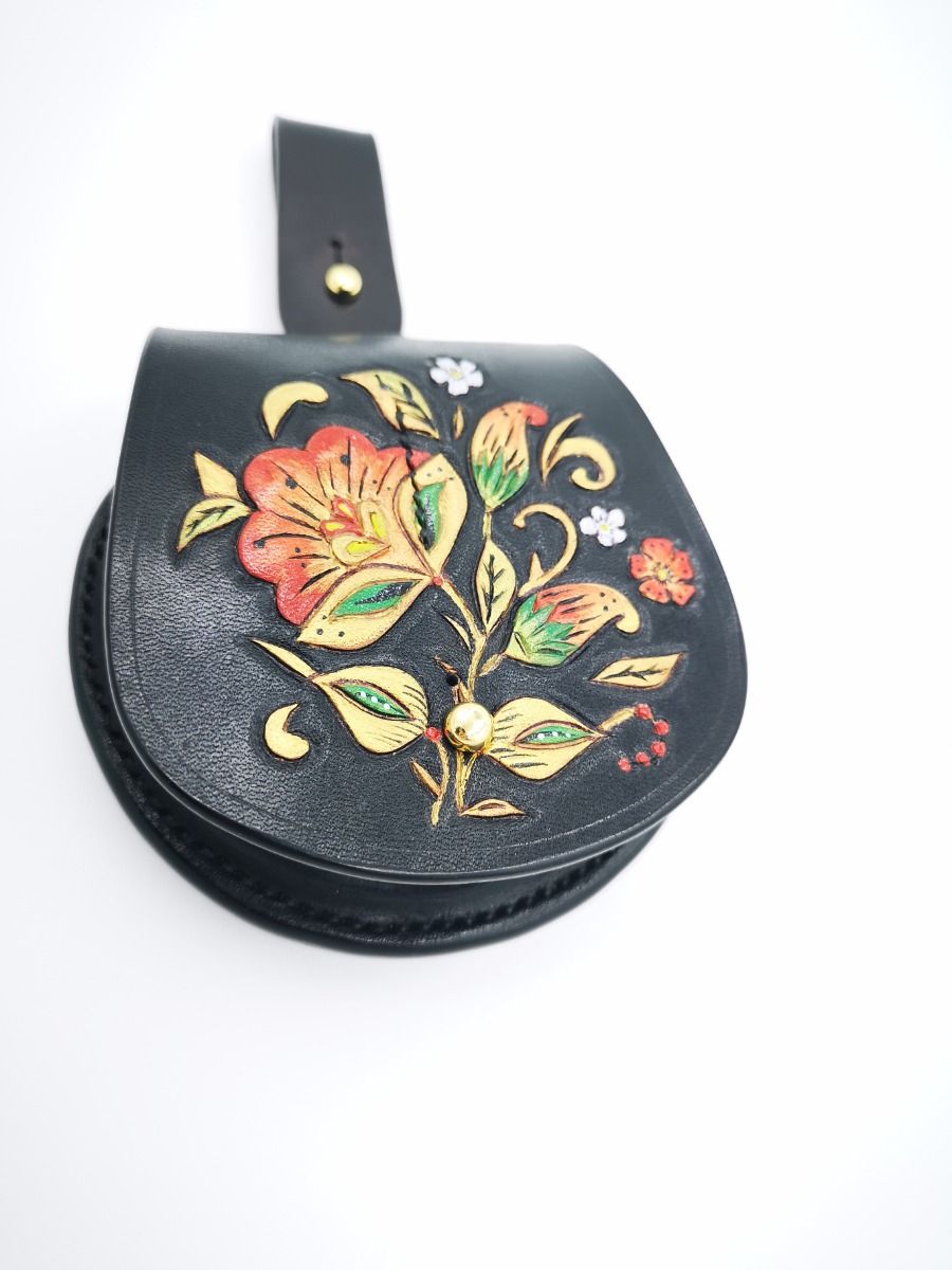 Es un monedero de piel, elaborado de manera artesanal, de forma redonda rígida. La tapa del monedero contiene un diseño floral, labrado y policromado. contiene una pequeña correa para llevar en el cinturón o en la asa de tu bolso. Ademas de las monedas, puedes llevar llaves, un usb o algo pequeño en este monedero. Pieza única.