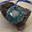Este modelo de orgonita colgante, es un modelo clásico, su composición es resina de poliéster con virutas de metal (aluminio), en una proporción al 50%, y un cuarzo en su interior. Color azul mar.