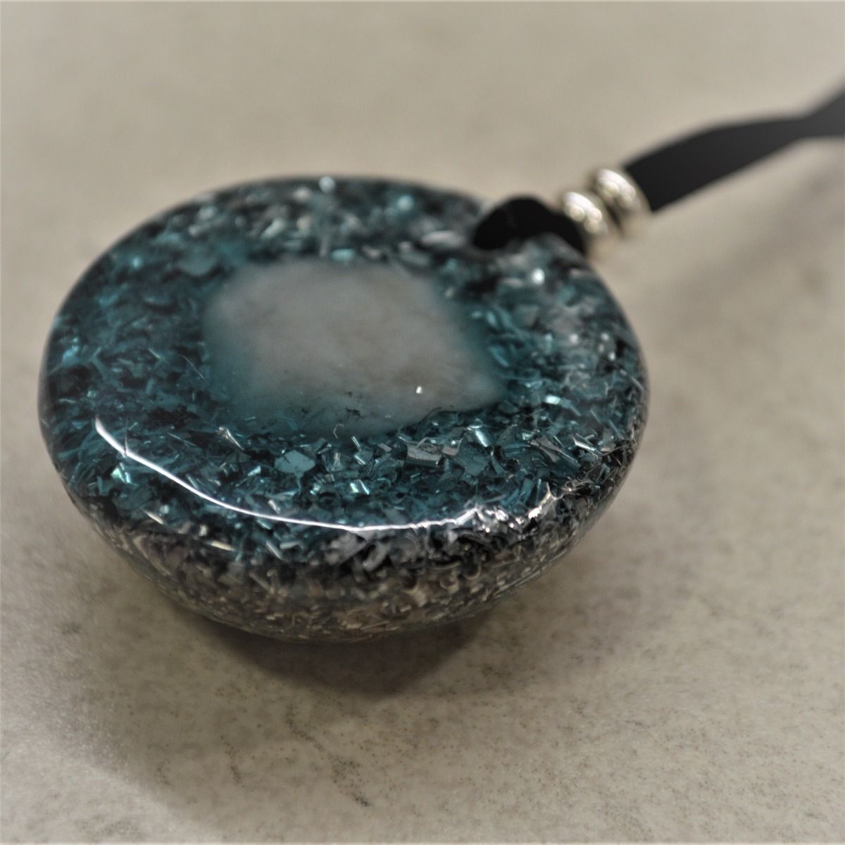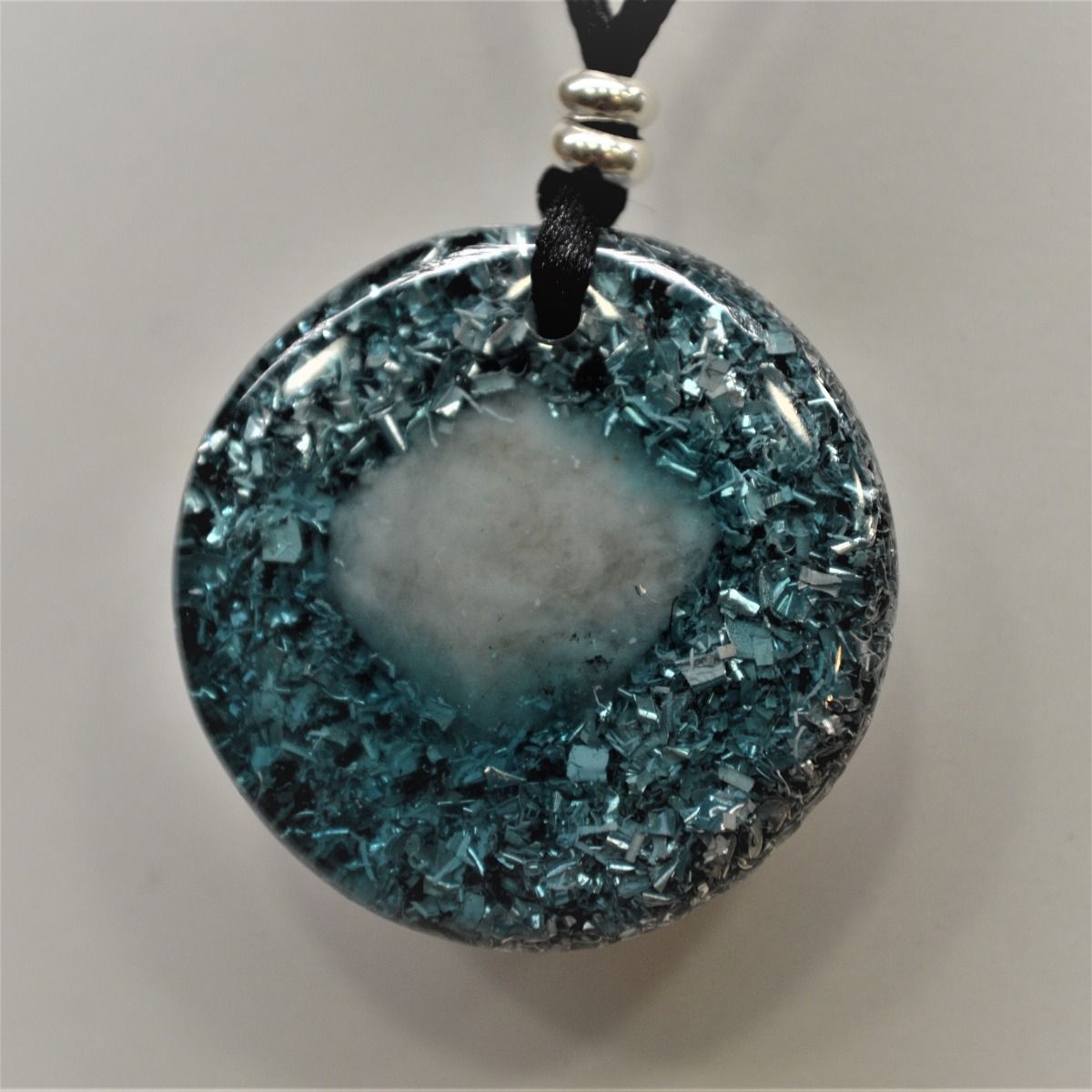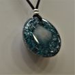 Este modelo de orgonita, es un modelo clásico, su composición es resina de poliéster, con virutas de metal (aluminio) en una proporción al 50%, chips de cuarzo y un cuarzo en su interior. Color azul mar.