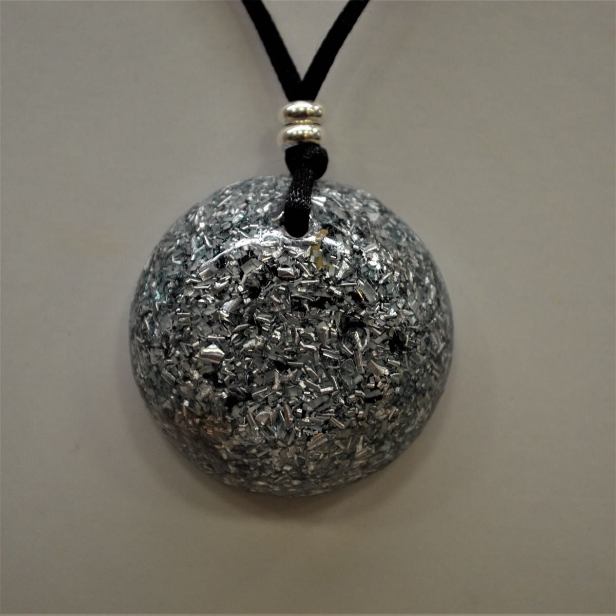 Este modelo de orgonita, es un modelo clásico, su composición es resina de poliéster con virutas de metal (aluminio) en una proporción al 50%, chips de cuarzo y en su interior se encuentra un cuarzo recogido en la montaña del Montseny, activados a la luz de la luna llena durante 3 noches y chips de cuarzo programados debidamente.