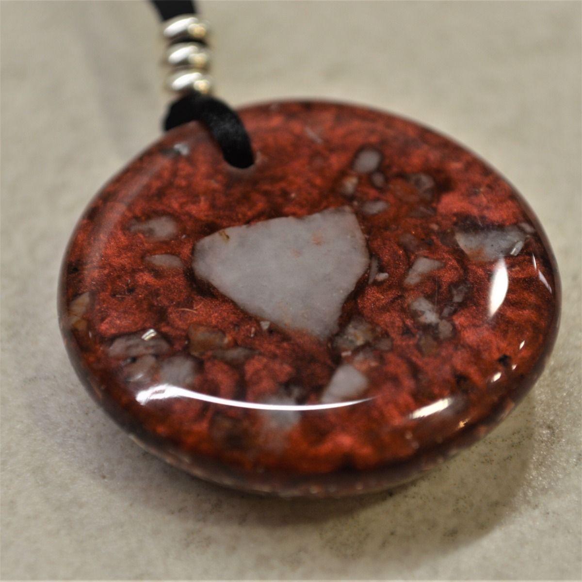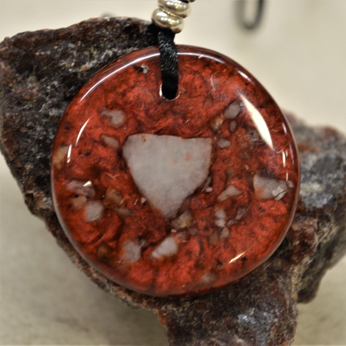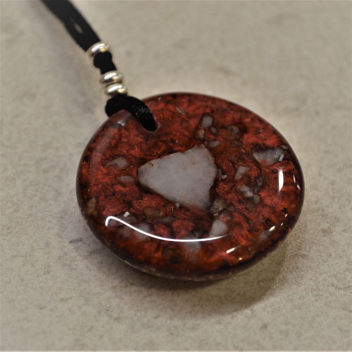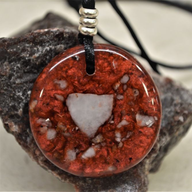 Este modelo de orgonita, es un modelo clásico, su composición es resina de poliéster, con virutas de metal (aluminio) en una proporción al 50% y un cuarzo en su interior. Color burdeos.