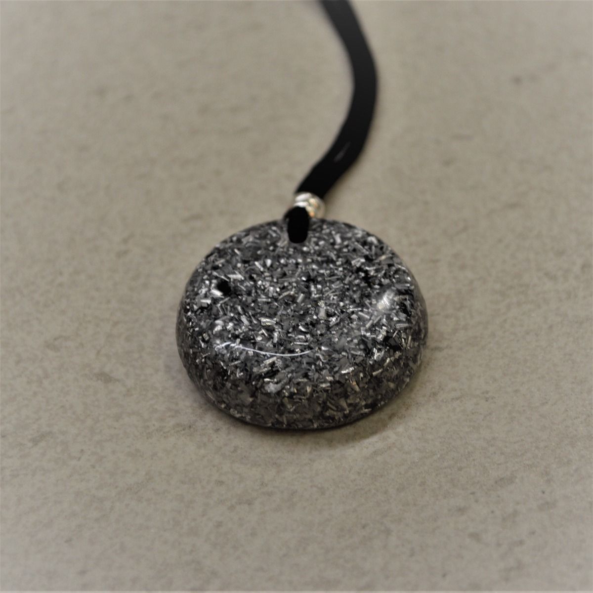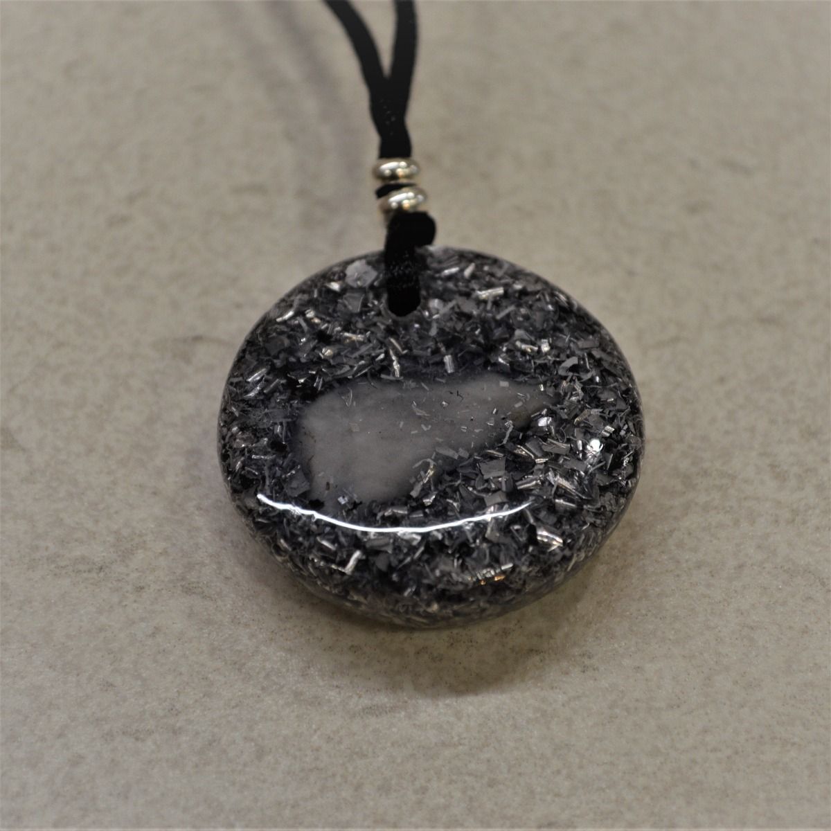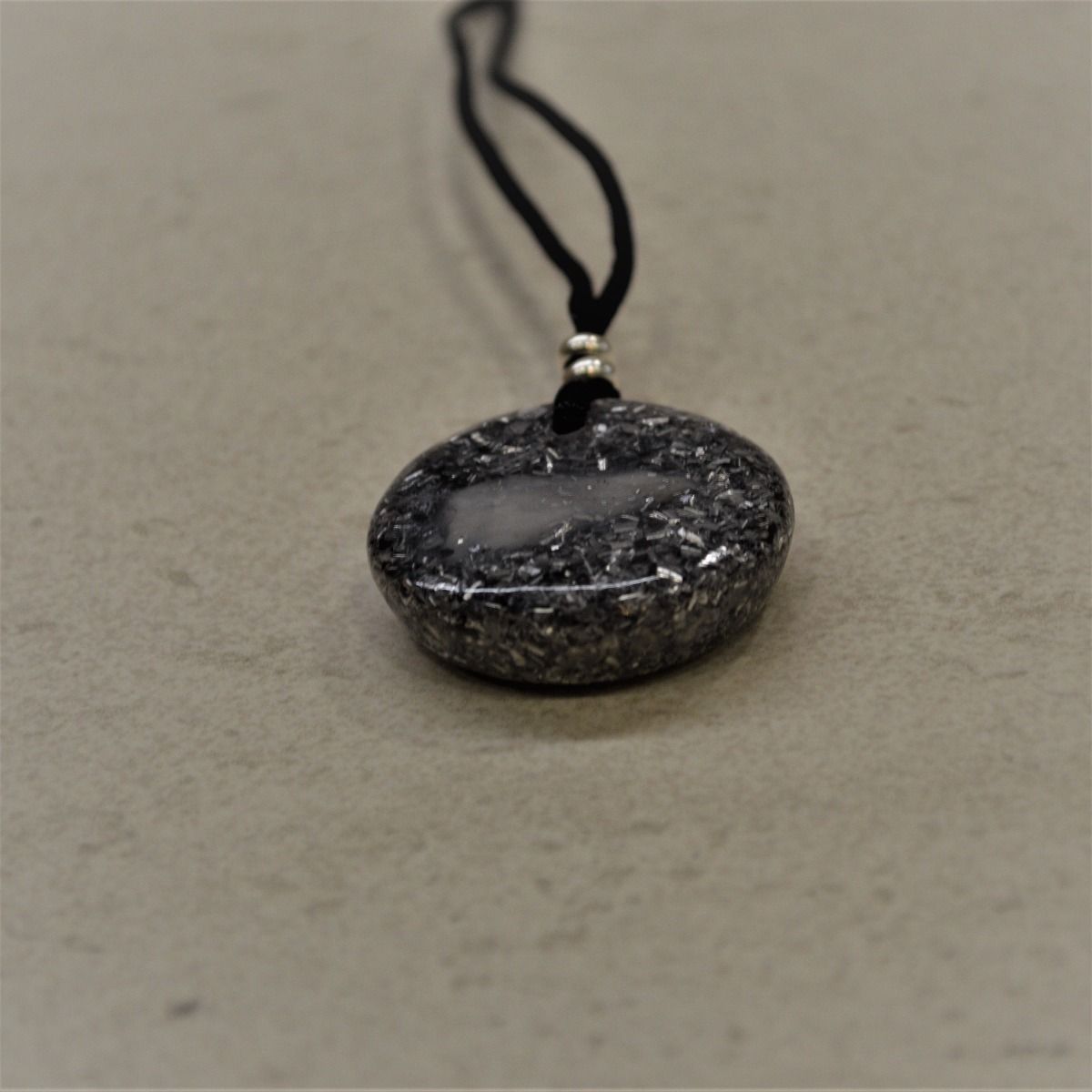 Este modelo de orgonita colgante, es un modelo clásico, su composición es resina de poliéster con virutas de metal (aluminio), en una proporción al 50%, y un cuarzo en su interior. Color gris.