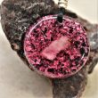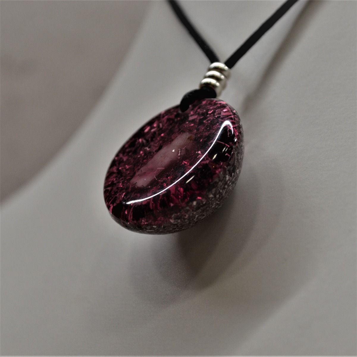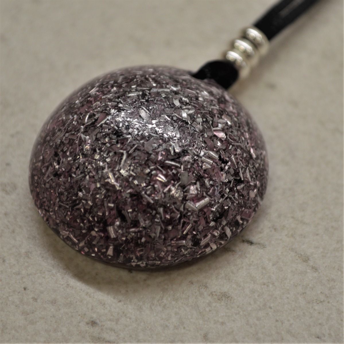 Este modelo de orgonita colgante, es un modelo clásico, su composición es resina de poliéster, con virutas de metal (aluminio) en una proporción al 50%, chips de Shungita y un cuarzo en su interior. Color rosa fucsia.