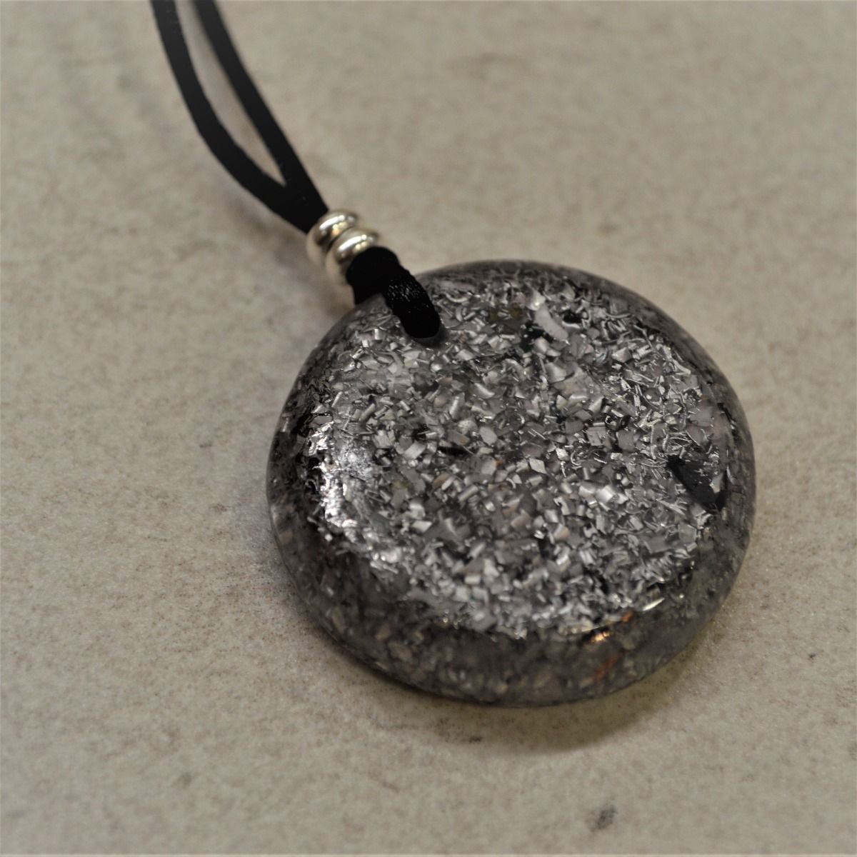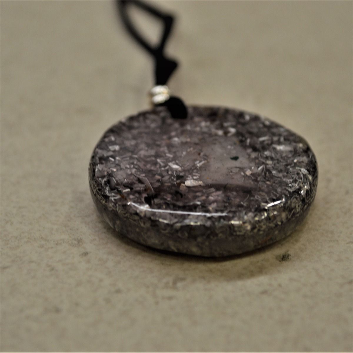 Este modelo de orgonita, es un modelo clásico, su composición es resina de poliéster con virutas de metal (aluminio) en una proporción al 50%, chips de Shungita, y en su interior un cuarzo recogido en la montaña del Montseny, activados a la luz de la luna llena durante 3 noches y programados debidamente.