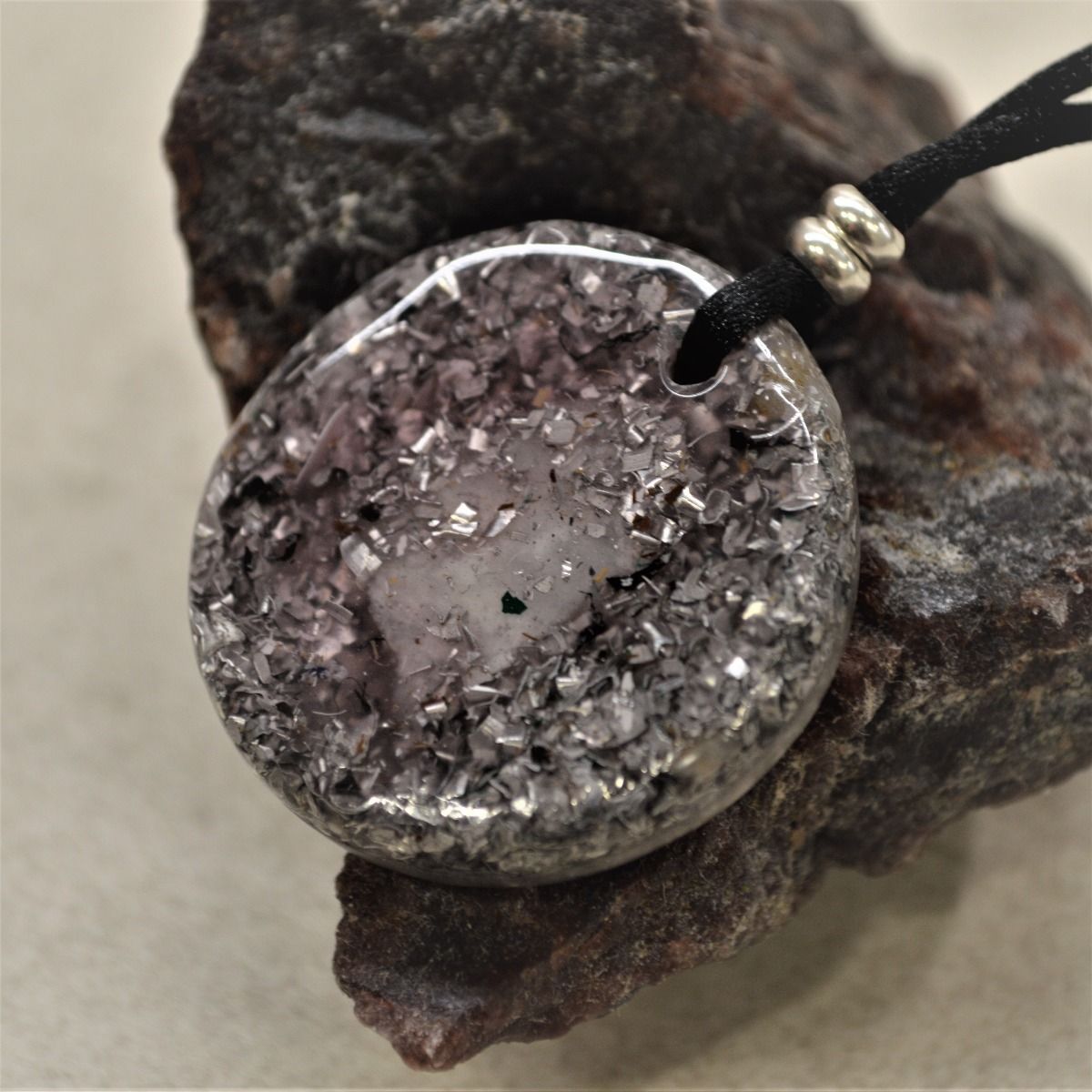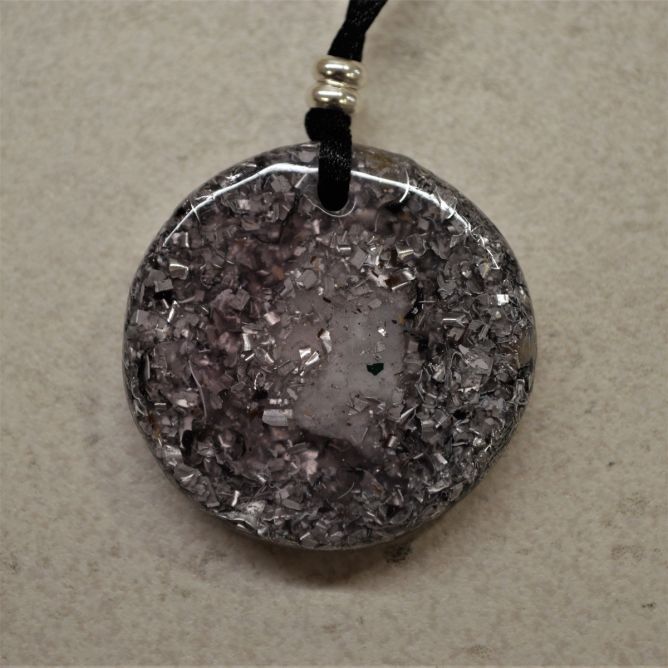 Este modelo de orgonita, es un modelo clásico, su composición es resina de poliéster, con virutas de metal (aluminio) en una proporción al 50%, chips de Shungita y un cuarzo en su interior. Color gris suave con ligero tono rosado.