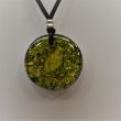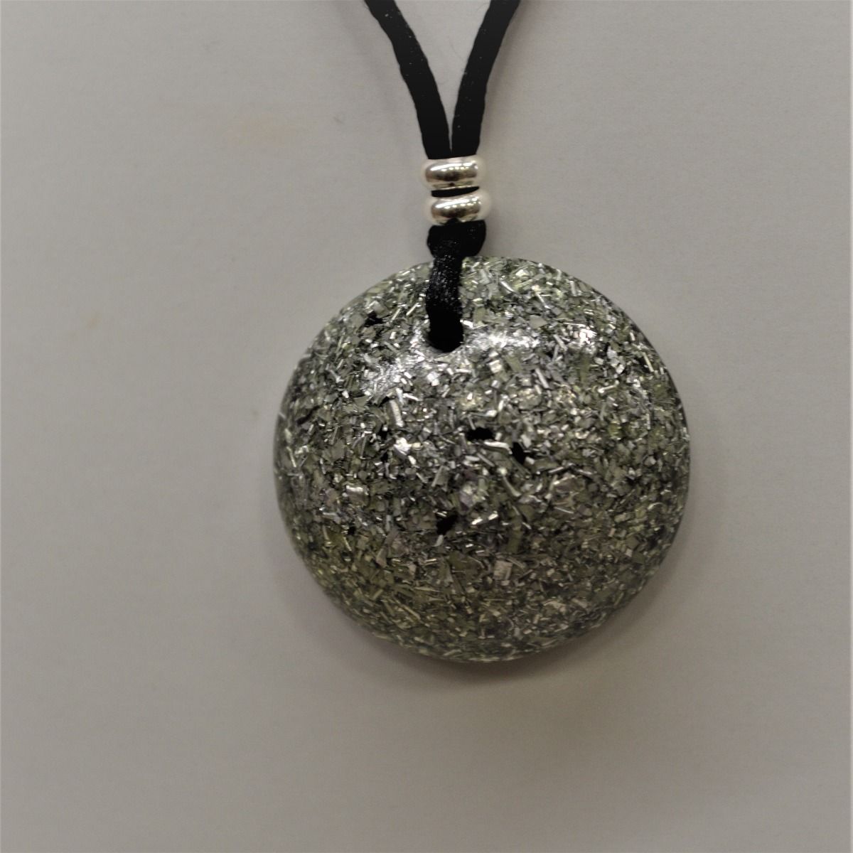 Este modelo de orgonita colgante, es un modelo clásico, su composición es resina de poliéster con virutas de metal (aluminio), en una proporción al 50%, y un cuarzo en su interior. Color verde pistacho.