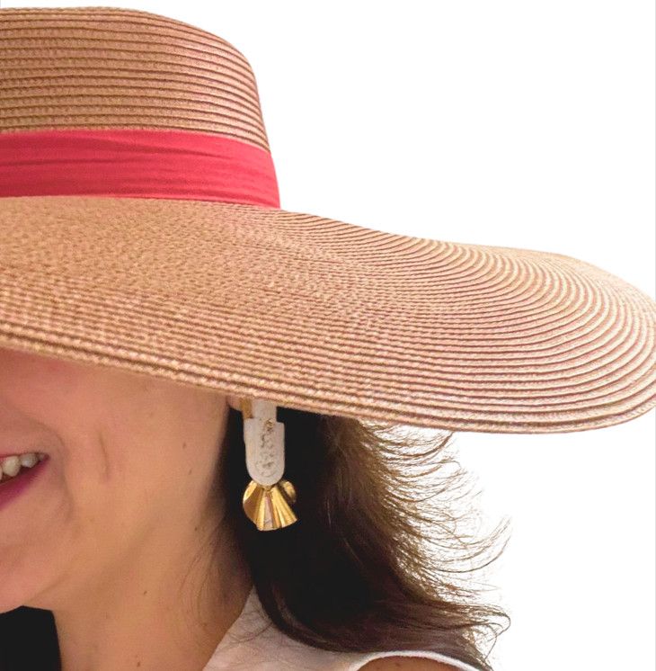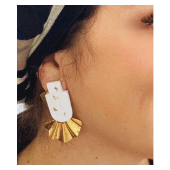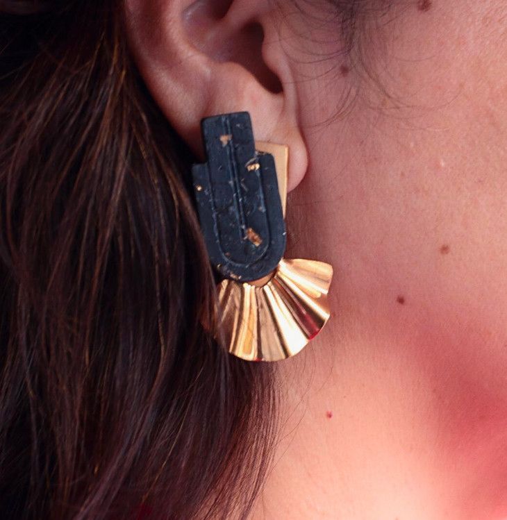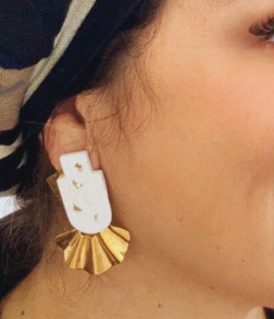 Pendientes elaborados en resina ecológica con residuos de plataneras, pan de oro 14kt y metal con baño de plata y oro 18kt. Cada par es original gracias a su proceso de elaboración manual, desde el tornado del vuelo en metal hasta la pieza de resina.