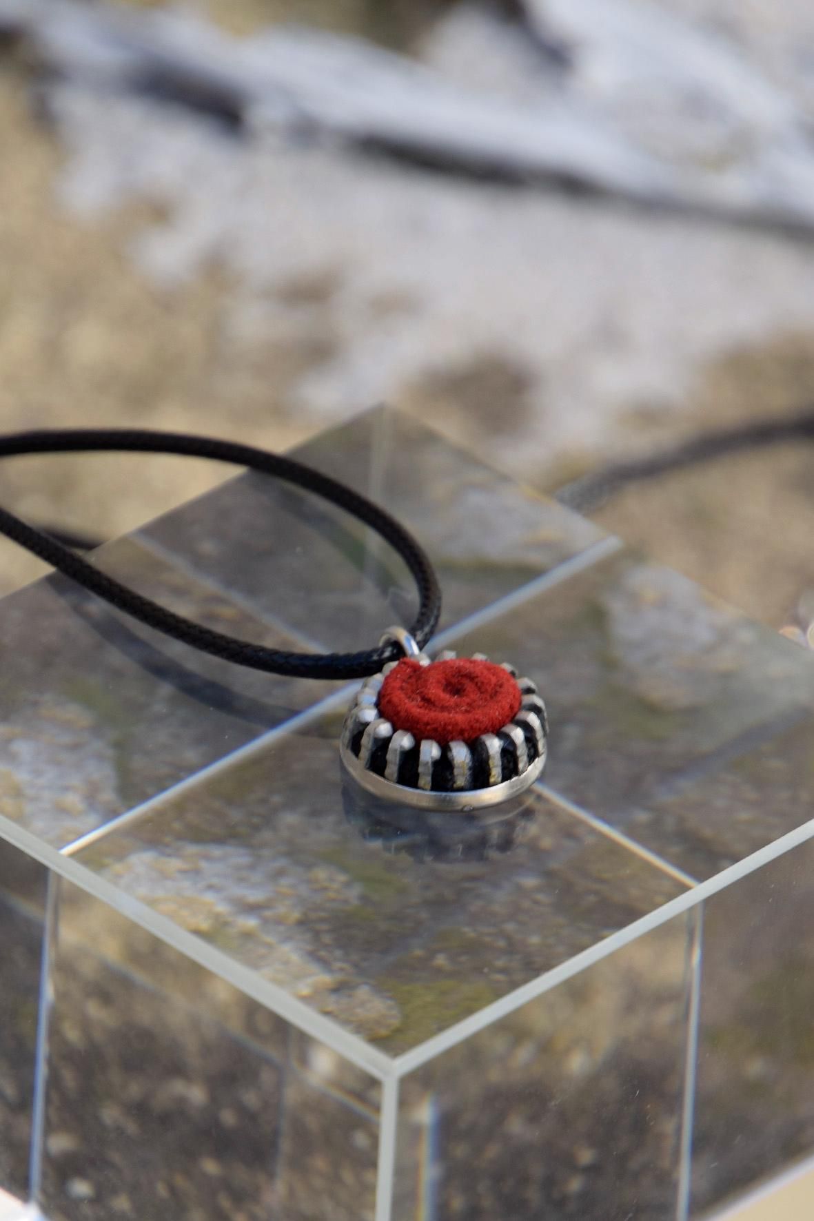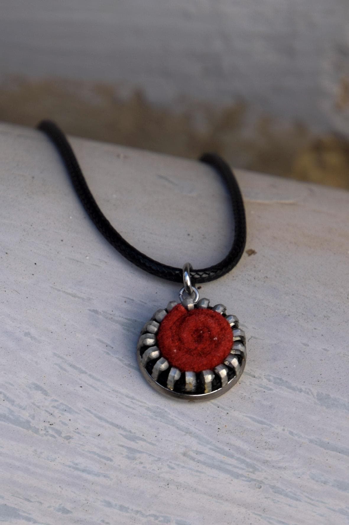 pequeño collar de forma circular hecho de cremalleras y serraje reciclado de color rojo