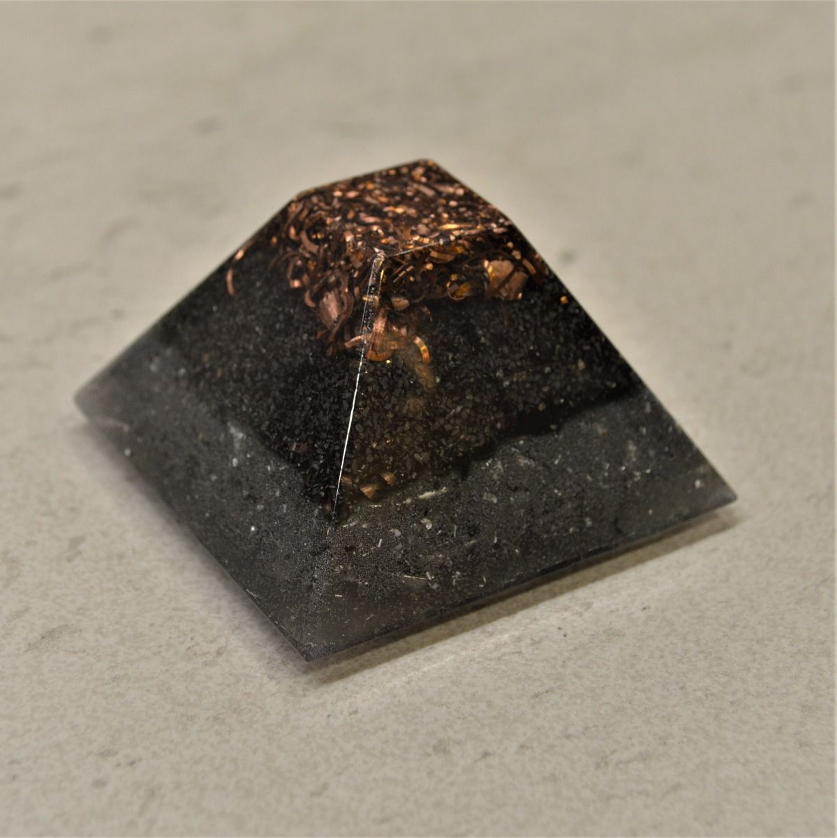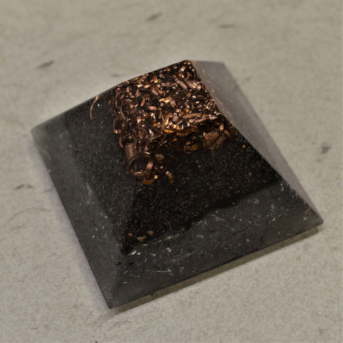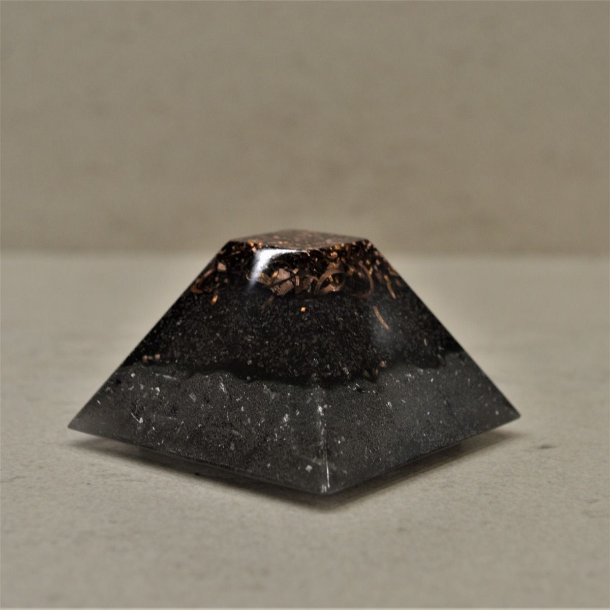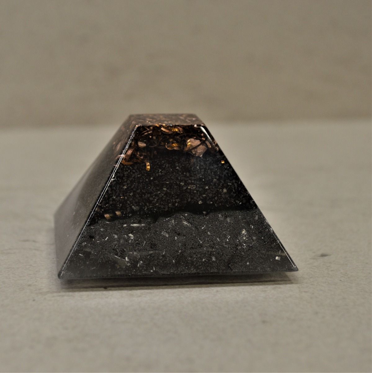 La composición de esta pirámide-orgonita, es resina de poliéster con virutas de metal (aluminio, hierro, bronce, cobre) en una proporción al 50%, y en su interior un cuarzo recogido en la montaña del Montseny, activados durante 3 noches a la luz de la luna llena y programados debidamente.