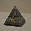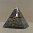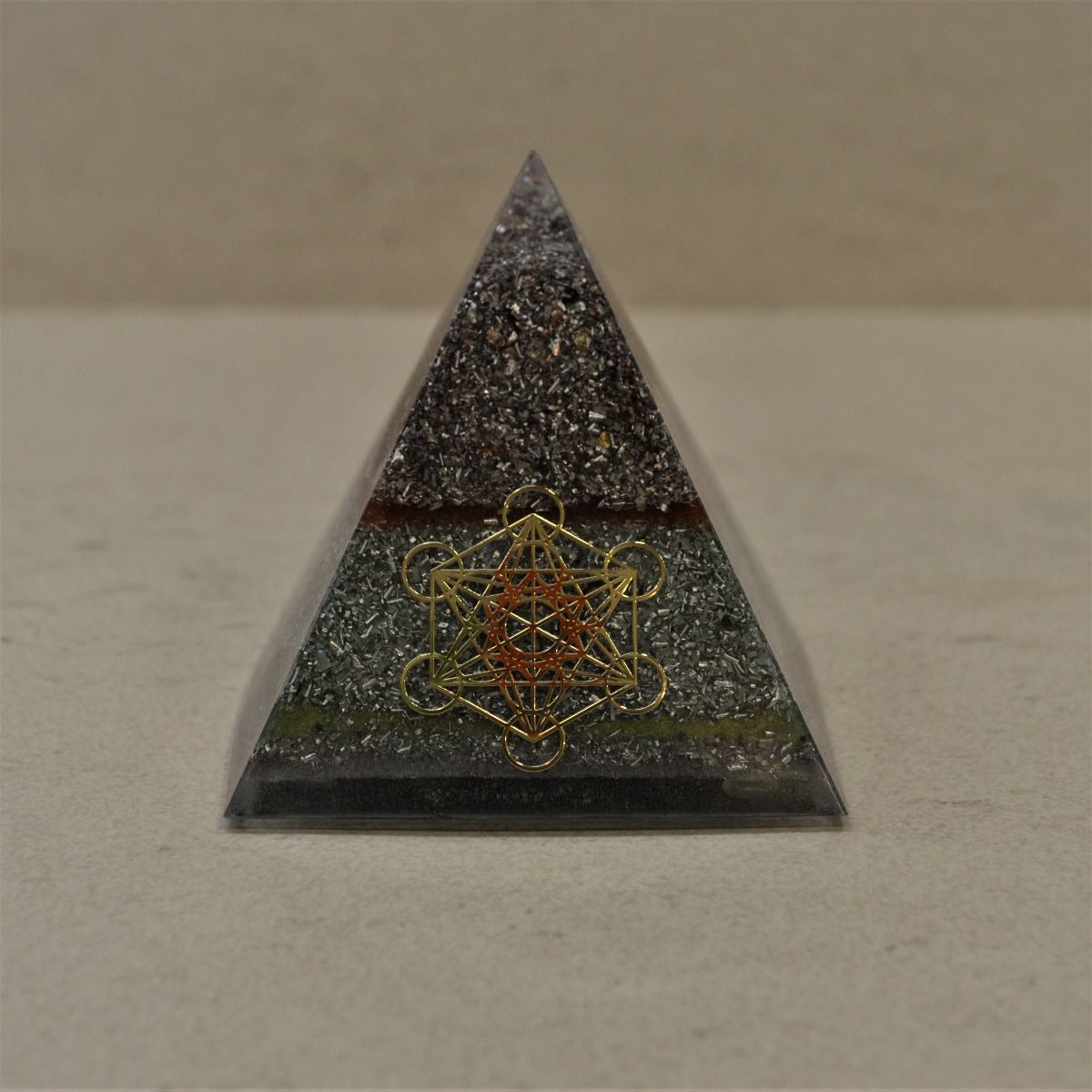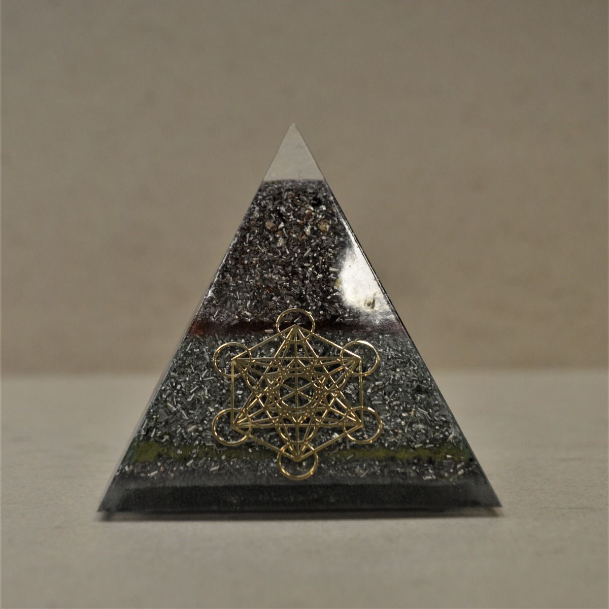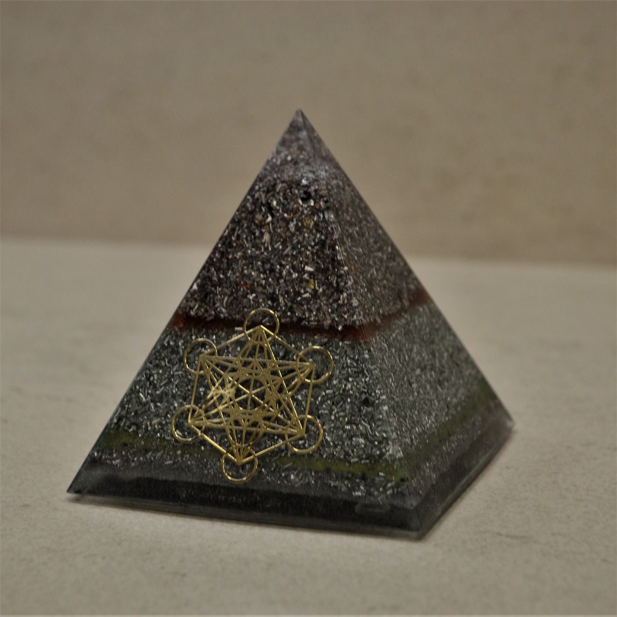 Pirámide orgonita ultraprotectora. Está compuesta de resina de poliéster con virutas de metal (aluminio, hierro, latón, acero, cobre) en una proporción al 50%, y en su interior un cuarzo, chips de cuarzo recogidos en la montaña del Montseny y ceniza de madera. El Cubo de Metatrón en una de sus caras.