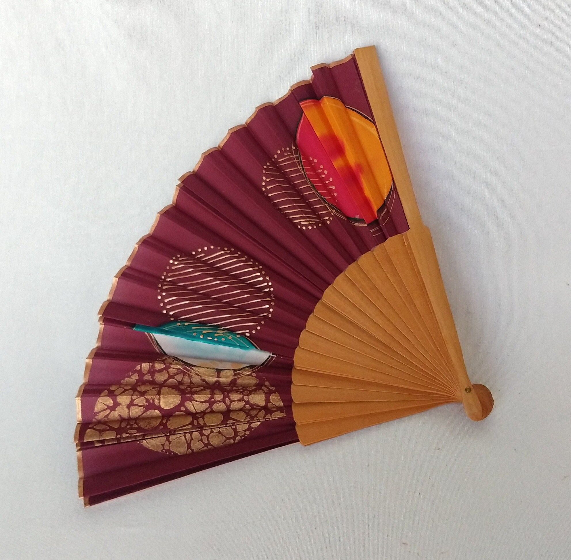 Descubra la fusión perfecta de elegancia y expresión artística con este abanico de seda pintado a mano. El fondo burdeos intenso contrasta maravillosamente con el turquesa intenso, el rojo anaranjado cálido y los detalles dorados, creando una composición abstracta y sofisticada que se siente moderna y atemporal.