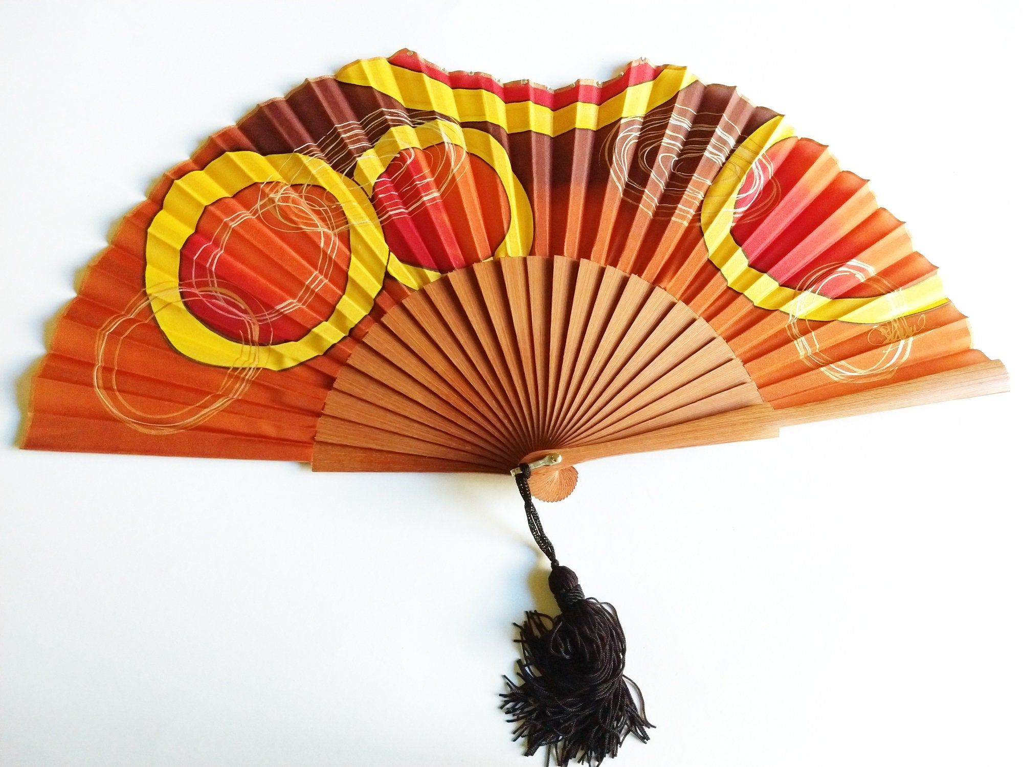 Este abanico de seda pintado a mano es una auténtica obra maestra de elegancia y artesanía. Con tonos cálidos de ámbar, oro y tierra intensos, acentuados con intrincados adornos de diamantes de imitación, este abanico es una lujosa pieza de diseño diseñada para quienes aprecian la sofisticación y el arte. La delicada borla negra añade un toque final de encanto atemporal.