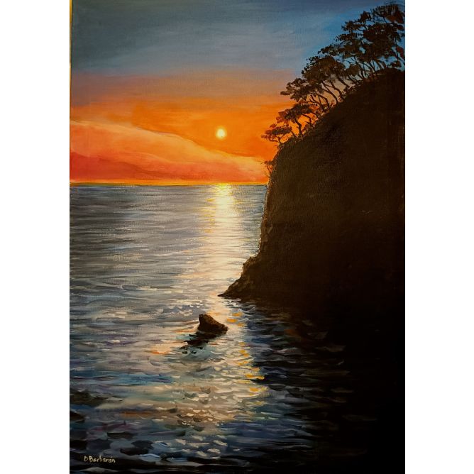 Atardecer con el sol cayendo sobre el mar, en uno de los escarpados acantilados de la costa cerca de l’Ampolla en la costa de Tarragona.
