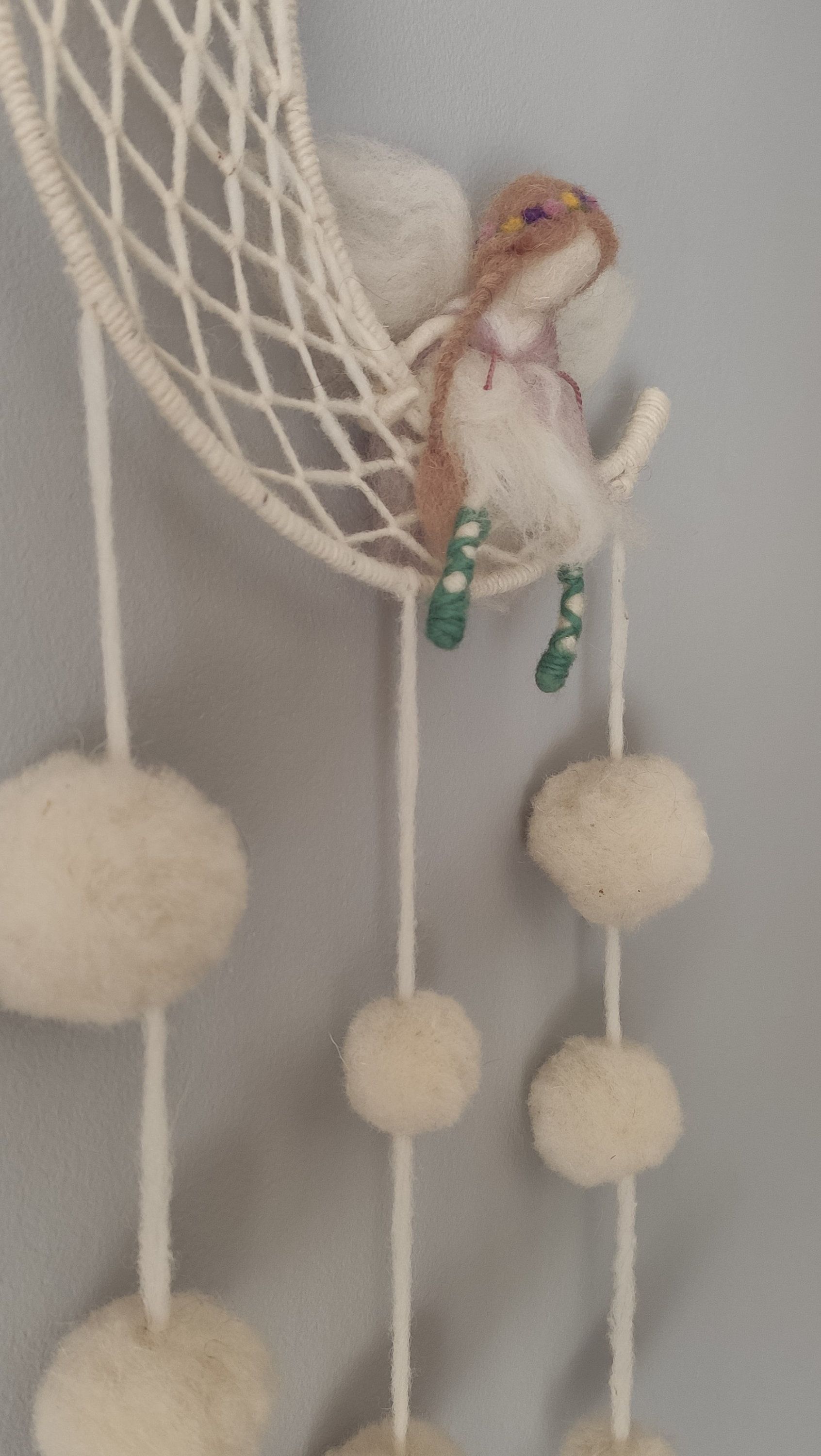 El Hada de los sueño . esta hecha en lana virgen blanca , con detalles en la vestimenta y el cabello con lana teñida con tintes vegetales
