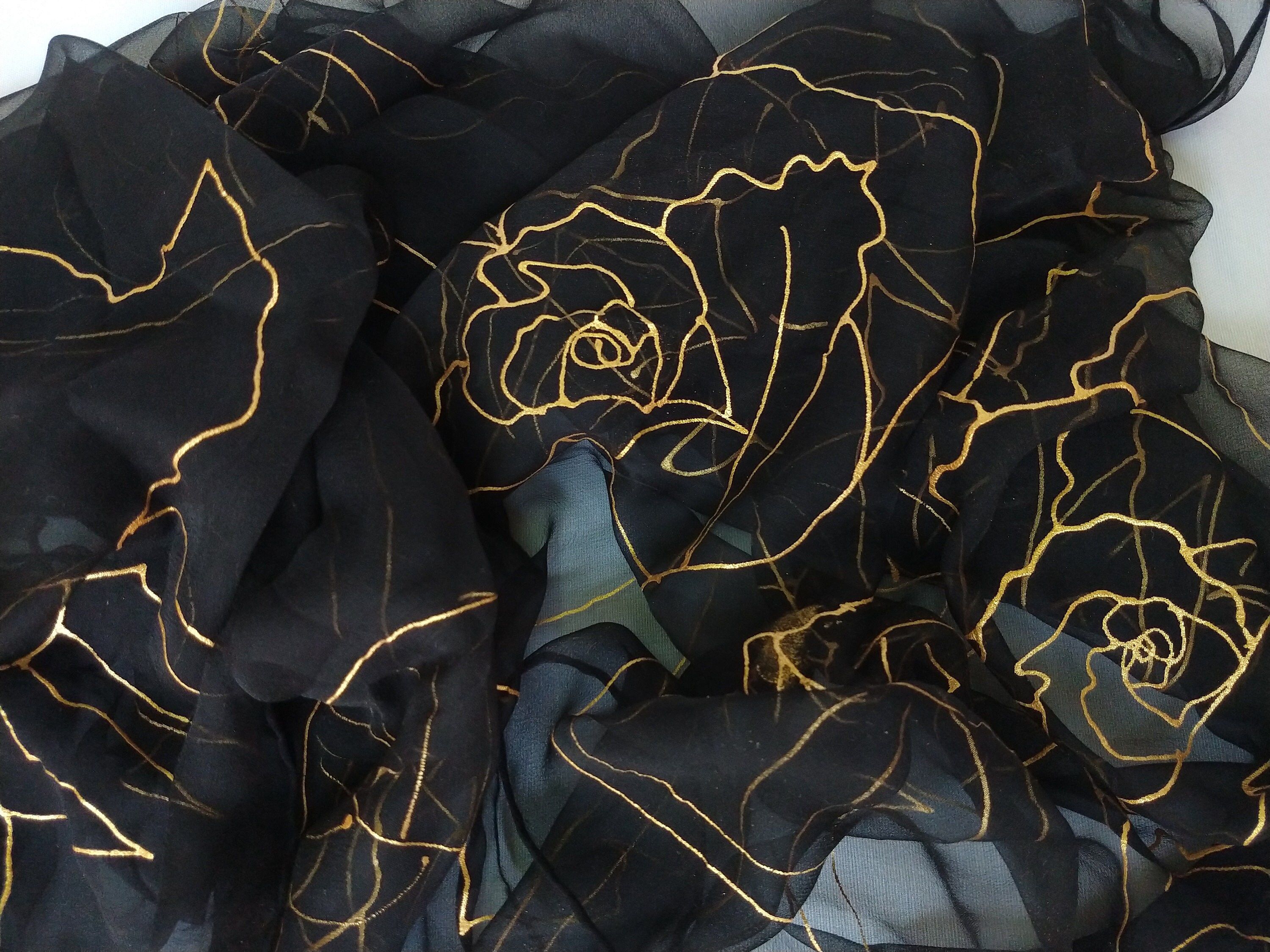Bufanda de seda floral de lujo, chal pintado a mano negro, bufanda de seda de flores grandes, envoltura de boda de verano, regalo de la madre de la novia