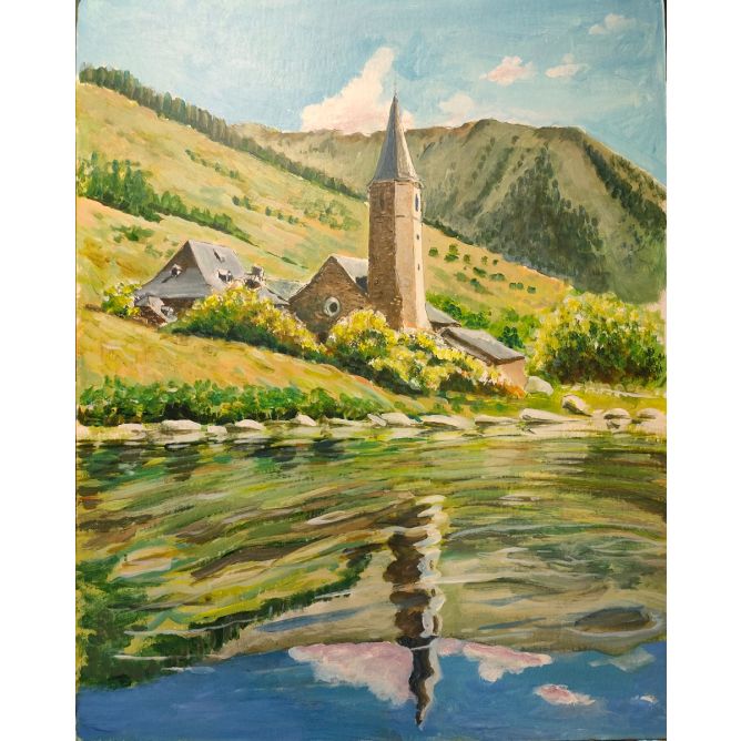 La iglesia y las casas de Montgarri, reflejadas en el agua, con las montañas del Valle de Arán detrás, son un espectáculo difícil de olvidar. No pude resistirme a pintar este óleo para tener un recuerdo
