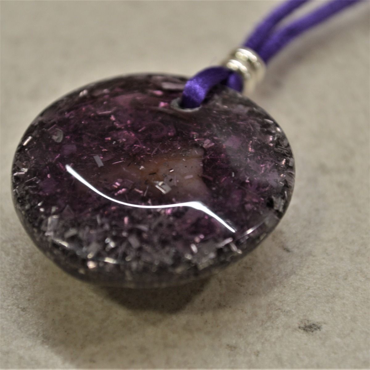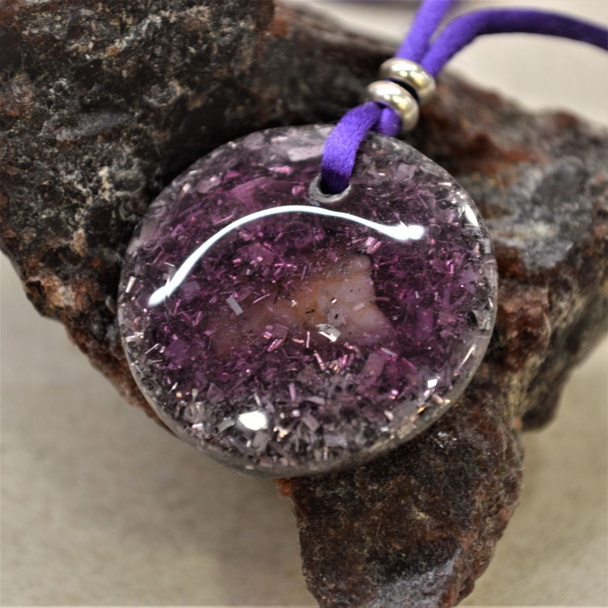 Este modelo de orgonita colgante, es un modelo clásico, su composición es resina de poliéster con virutas de metal (aluminio), en una proporción al 50%, y un cuarzo en su interior. Color violeta.