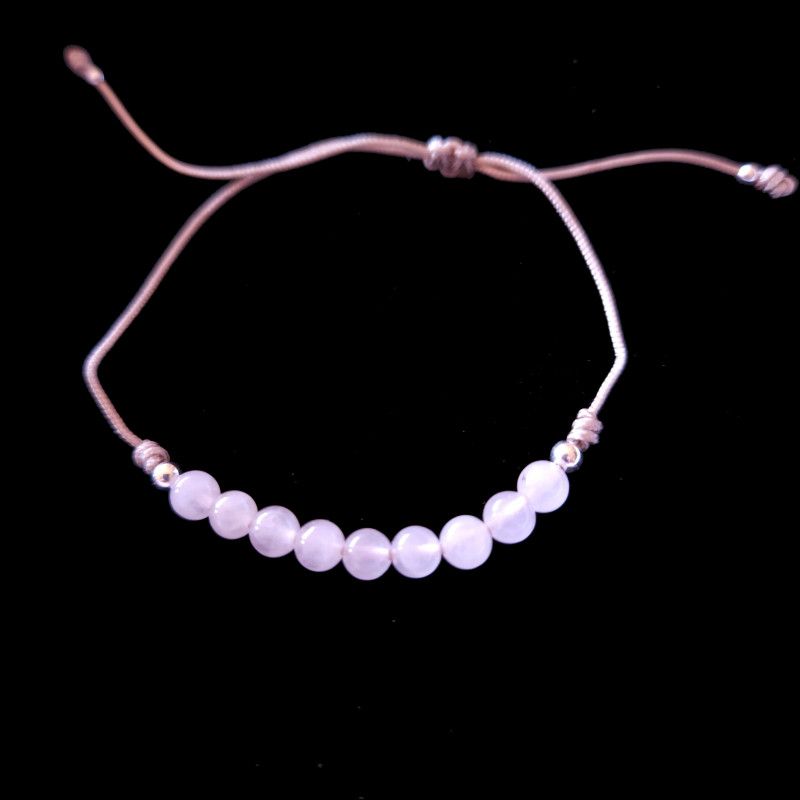 La pulsera ELEMENTAL, lleva sus propiedades escritas en una hoja reciclada con semillas de flores para plantar. La pulsera es de hilo, con bolitas de plata y está compuesta por 9 gemas de Cuarzo Rosa, que te aportarán aquello que necesitas.