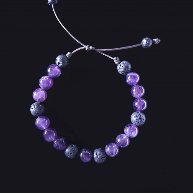 Pulsera HARNONY, realizada con hilo de poliéster de color gris piedra oscuro, en la que predomina el Amatista, acompañada de Lava.